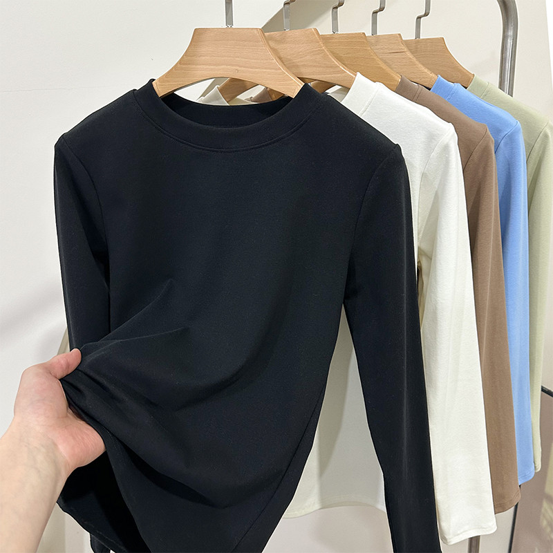 春秋薄款纯棉外穿长袖T恤修身显瘦上衣简约内搭圆领打底衫体恤女