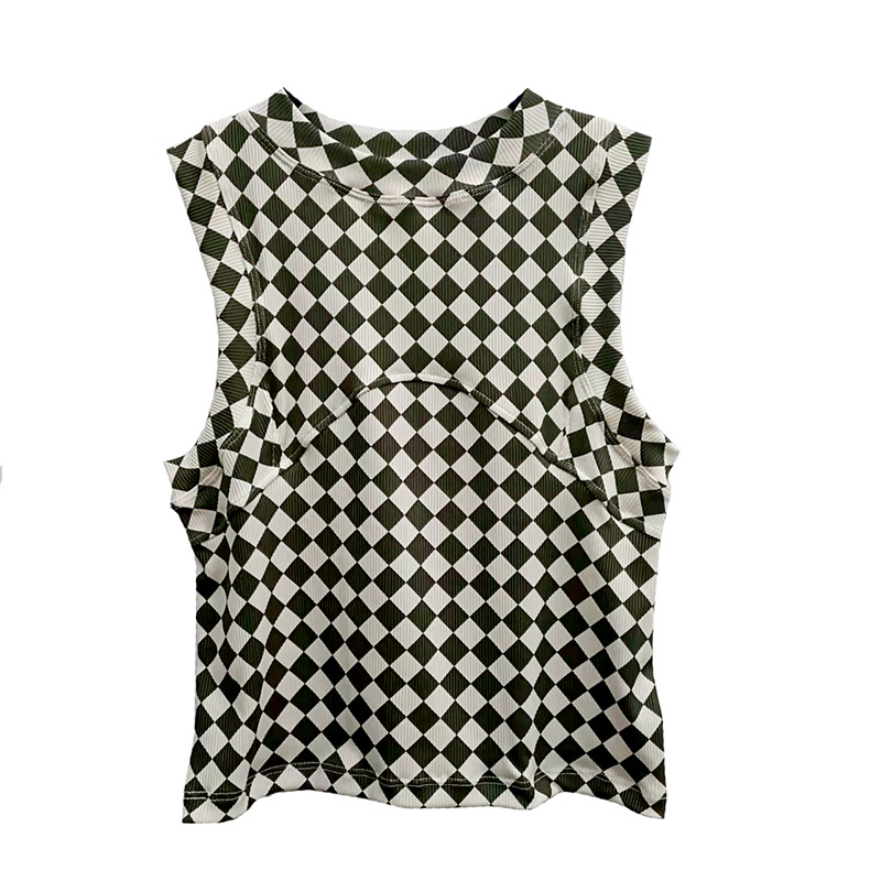 运动复古百搭格子无袖背心女夏季辣妹妹格子纹圆领短款打底衫上衣