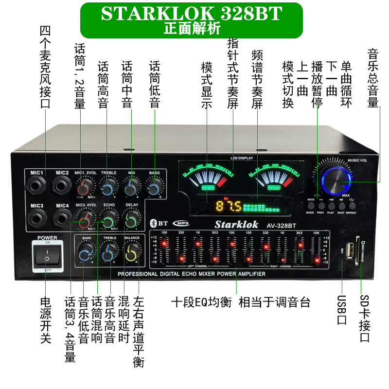 大功率家用功放蓝牙5.0震撼卡OK歌EQ均衡器12V广场舞车载户外两用