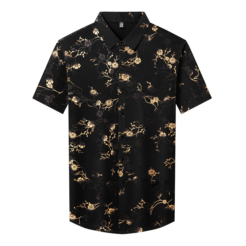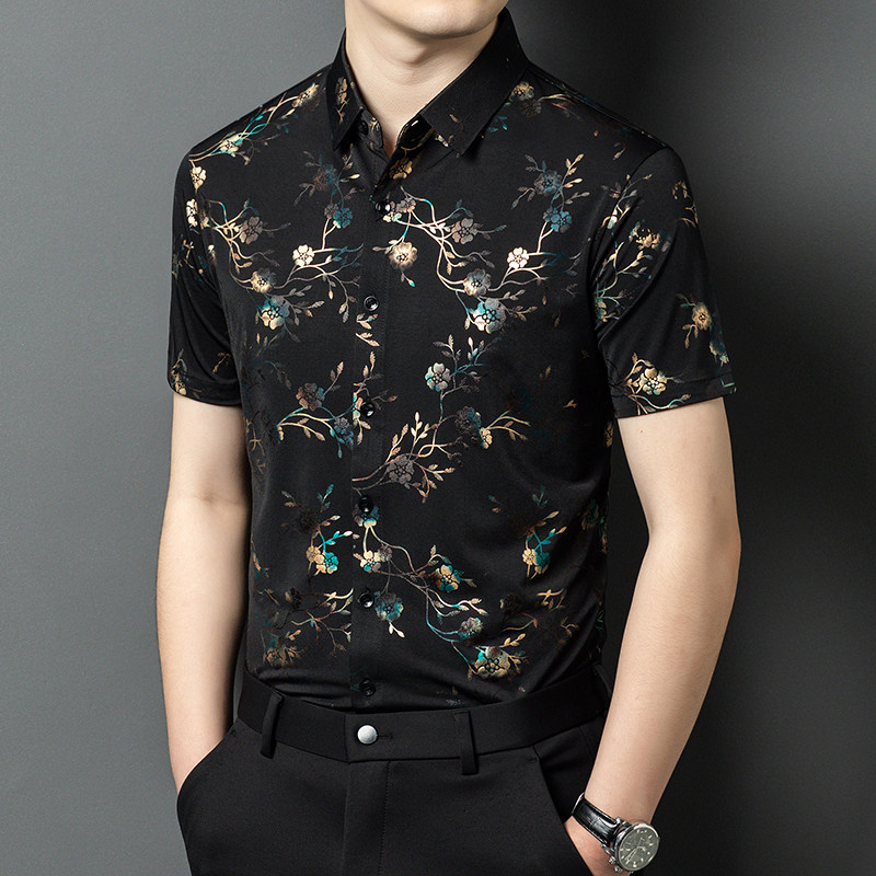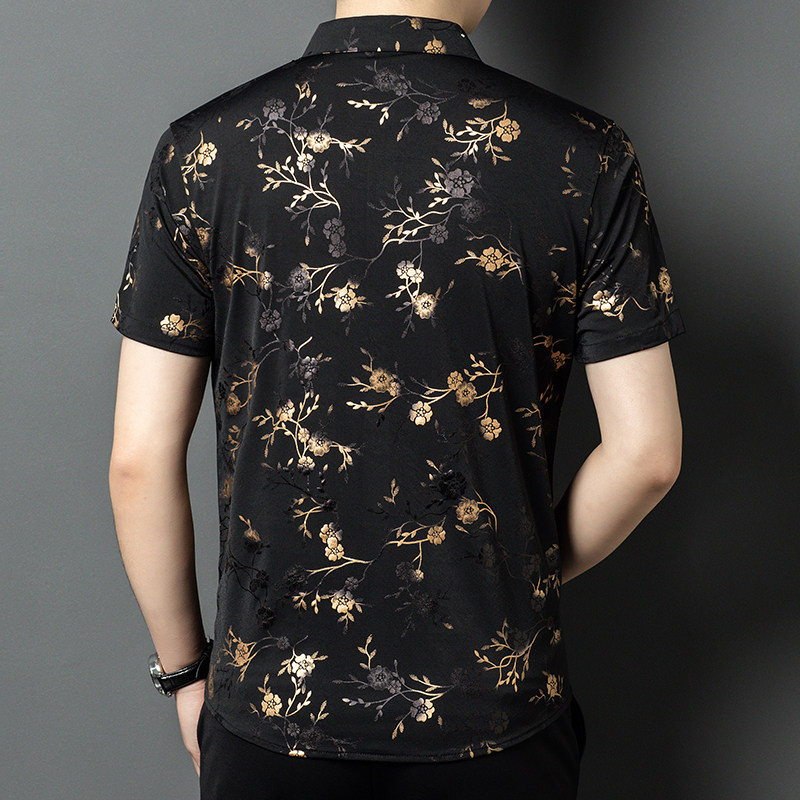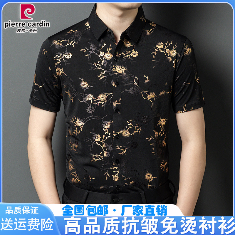 皮尔卡丹正品冰丝短袖衬衫男翻领商务休闲印花体恤衫夏季新款免烫