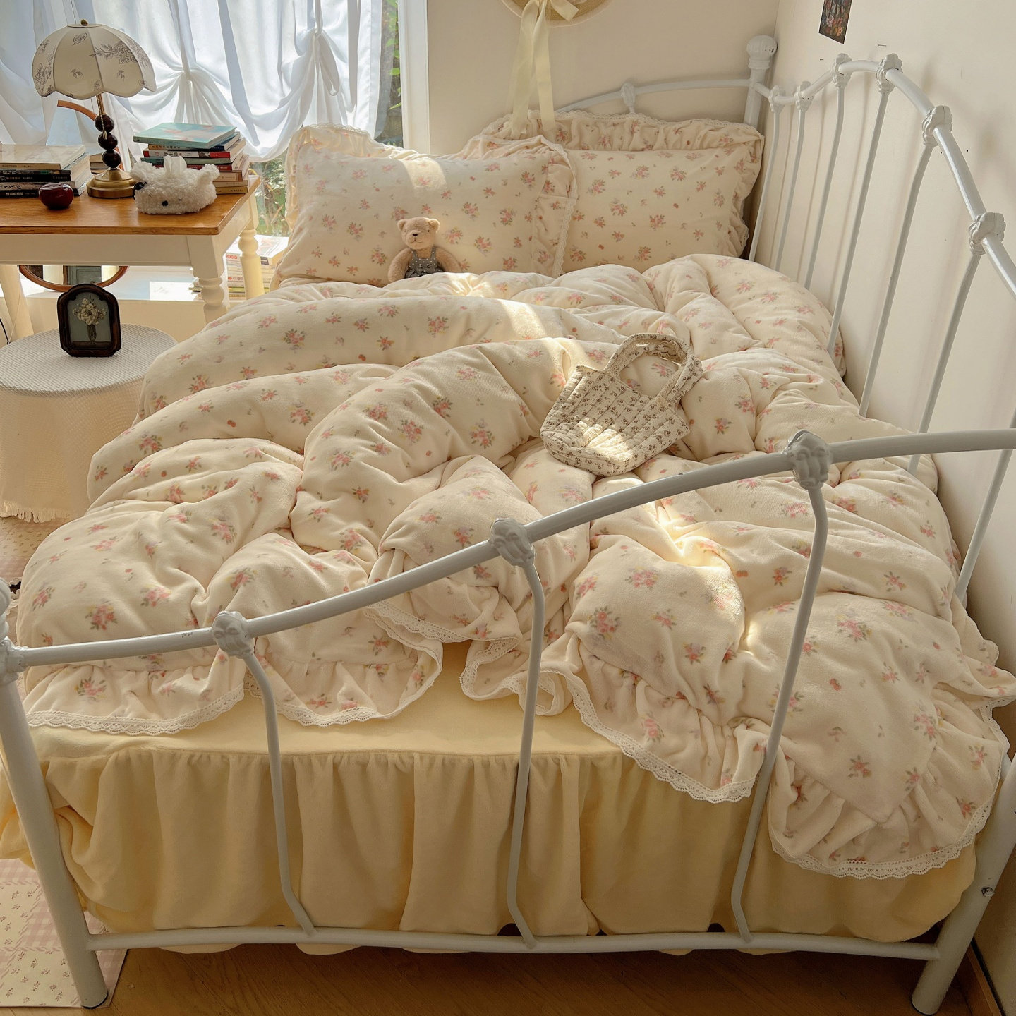 韩系碎花荷叶边牛奶绒四件套公主风保暖珊瑚绒被套仙美法兰绒床裙