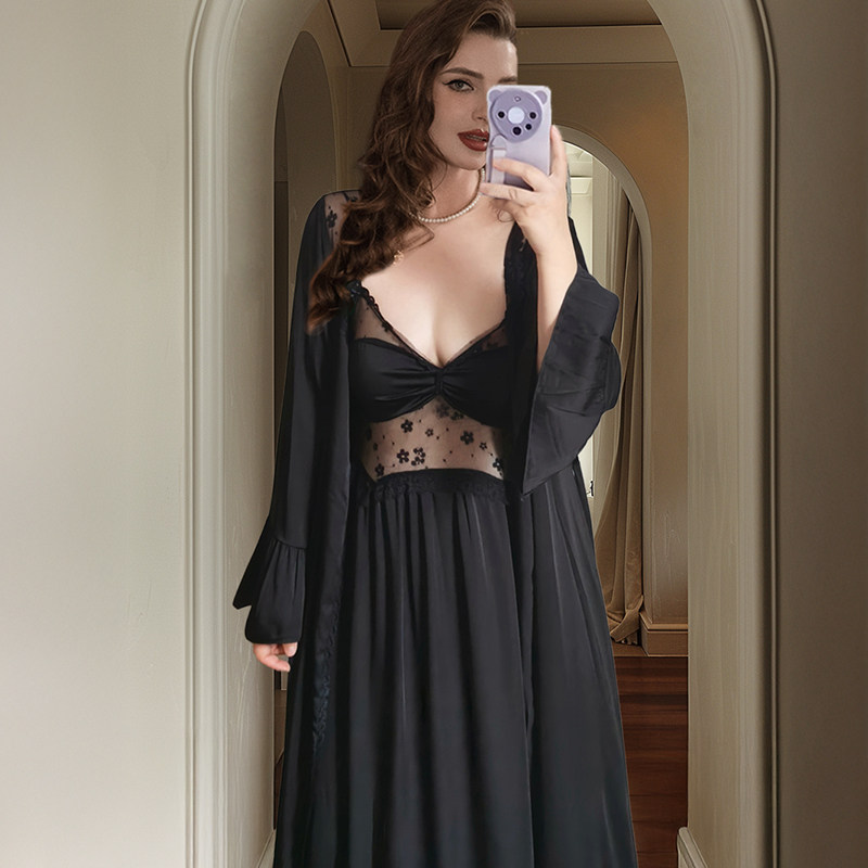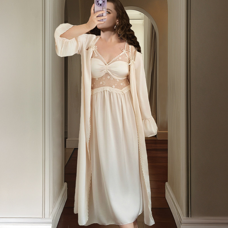大码性感睡衣女法式长款带胸垫睡裙高级感胖mm200斤晨袍两件套装