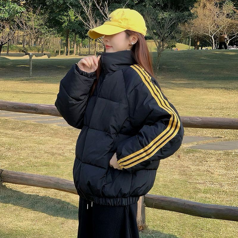 超时尚三条杠织带拼色保暖棉服女秋冬季宽松情侣装学生棉袄外套潮