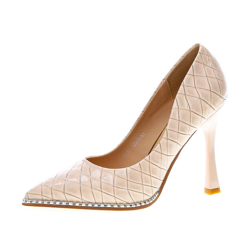 2025春季新款黑色通勤水钻格子细跟超高跟鞋防水台漆皮尖头单鞋女