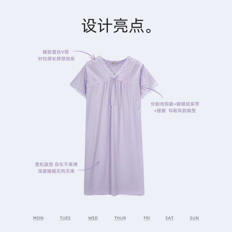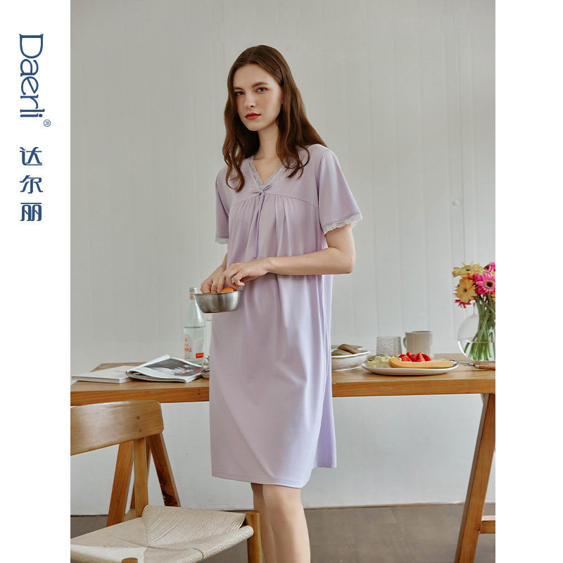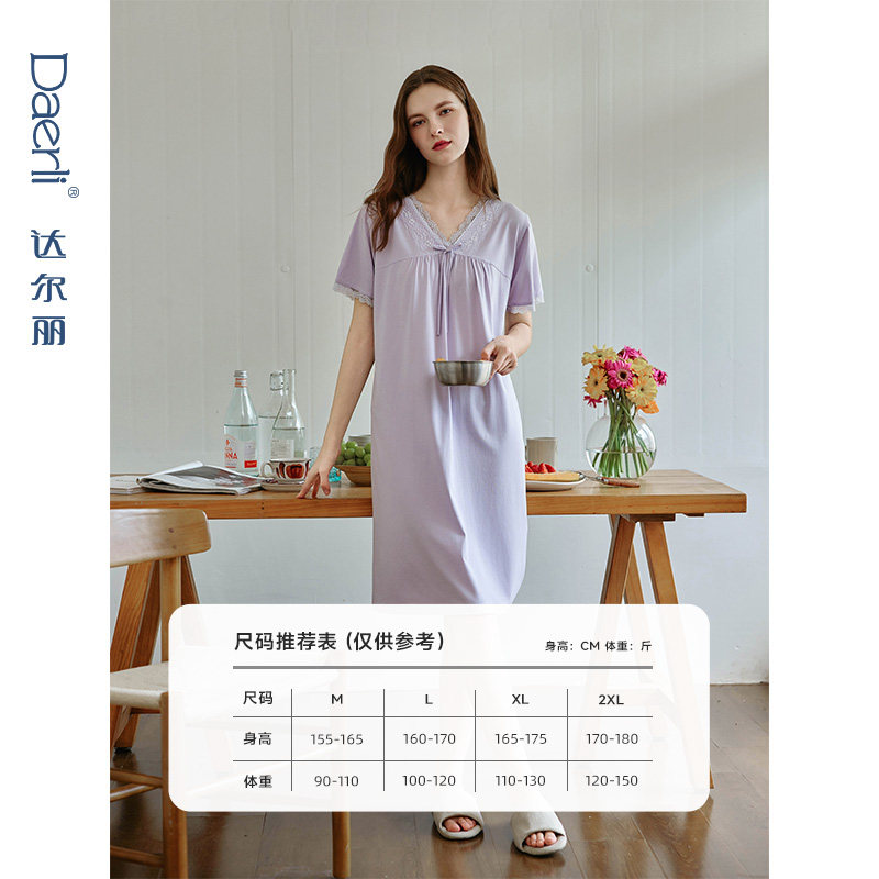 达尔丽柔软蕾丝V领纯棉睡裙女夏季短袖中裙2025新款显瘦薄连衣裙