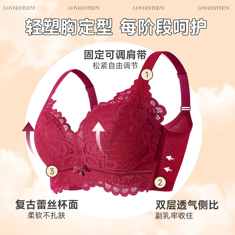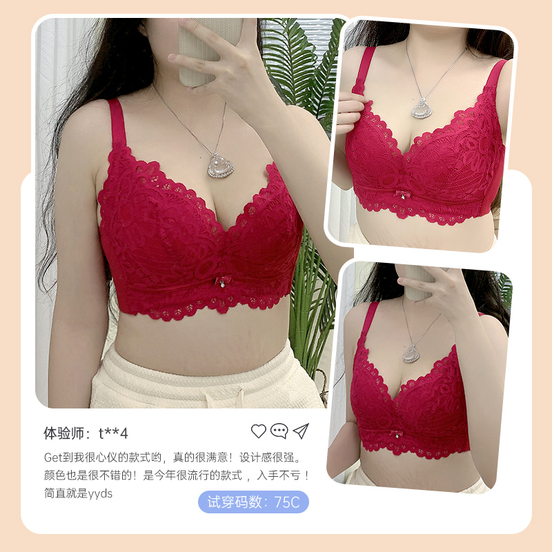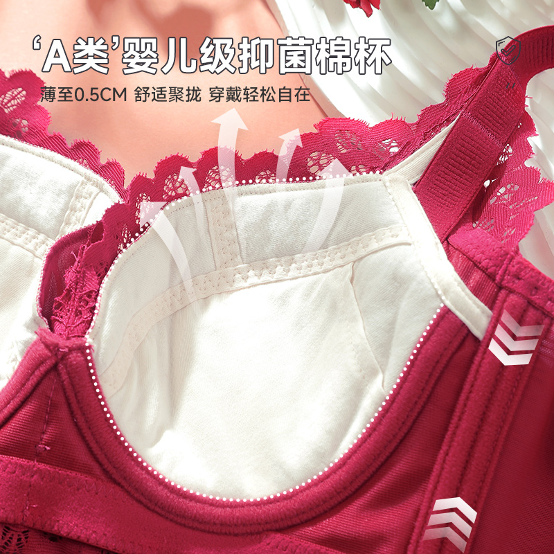 内衣女大胸显小性感蕾丝软钢圈上托侧收副乳本命年红色文胸罩薄款