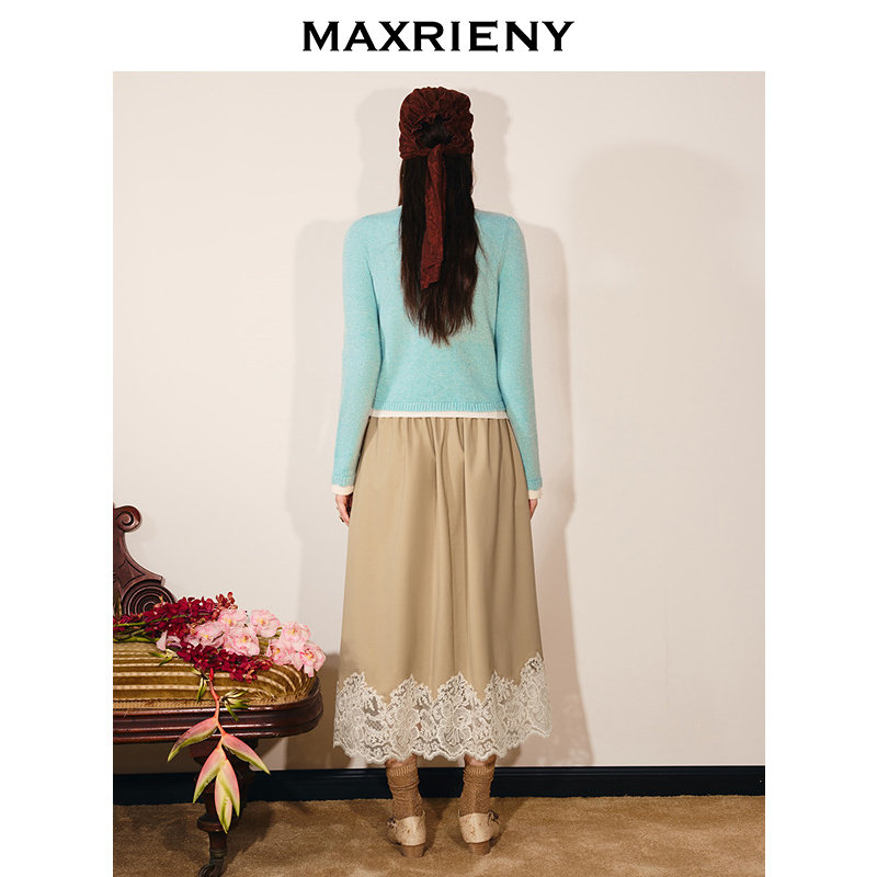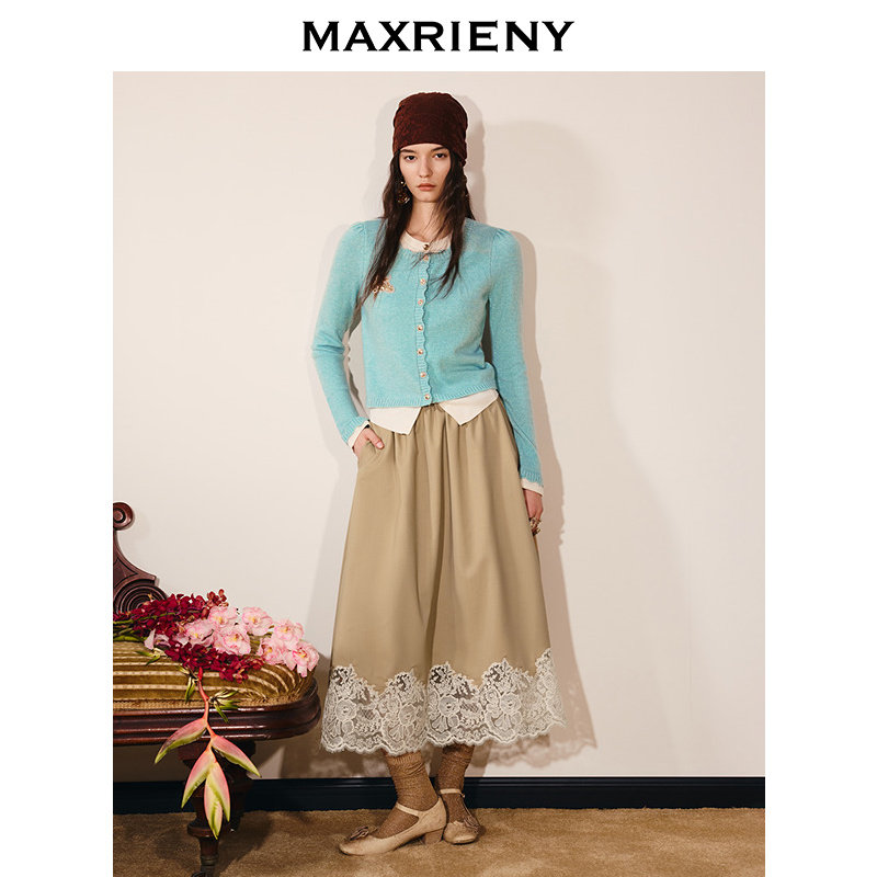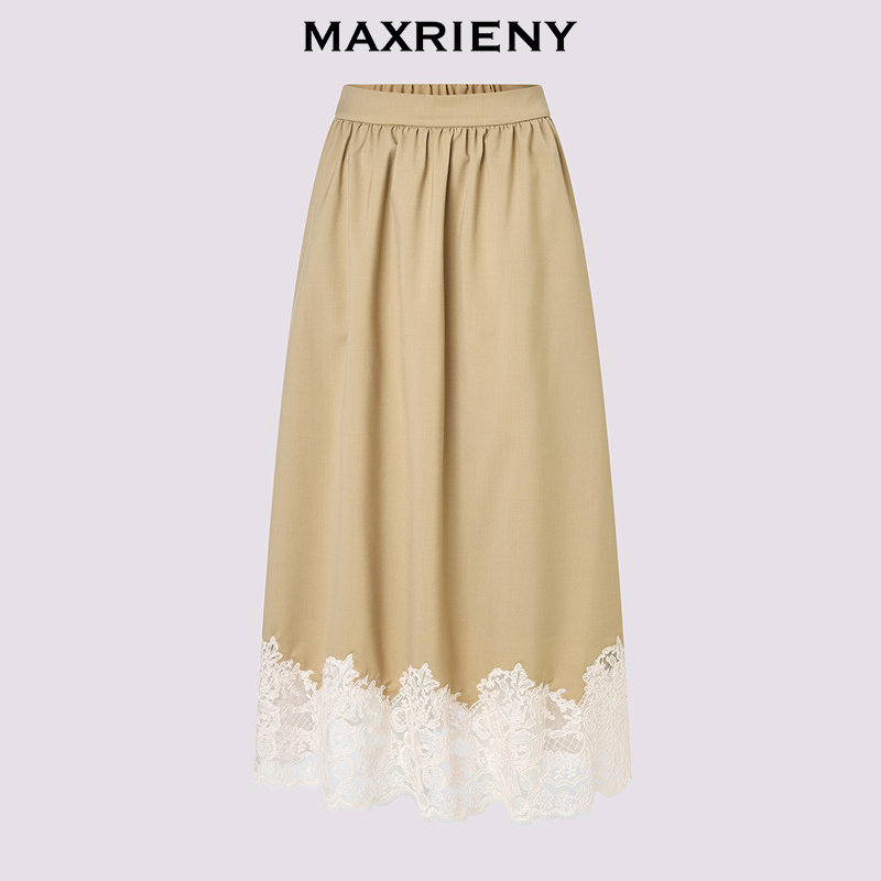 【商场同款】MAXRIENY卡其色羊毛半身裙2026春季新款蕾丝A字半裙