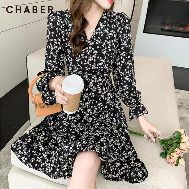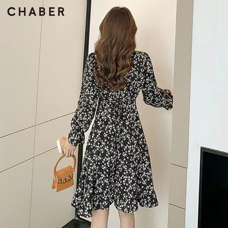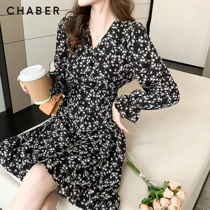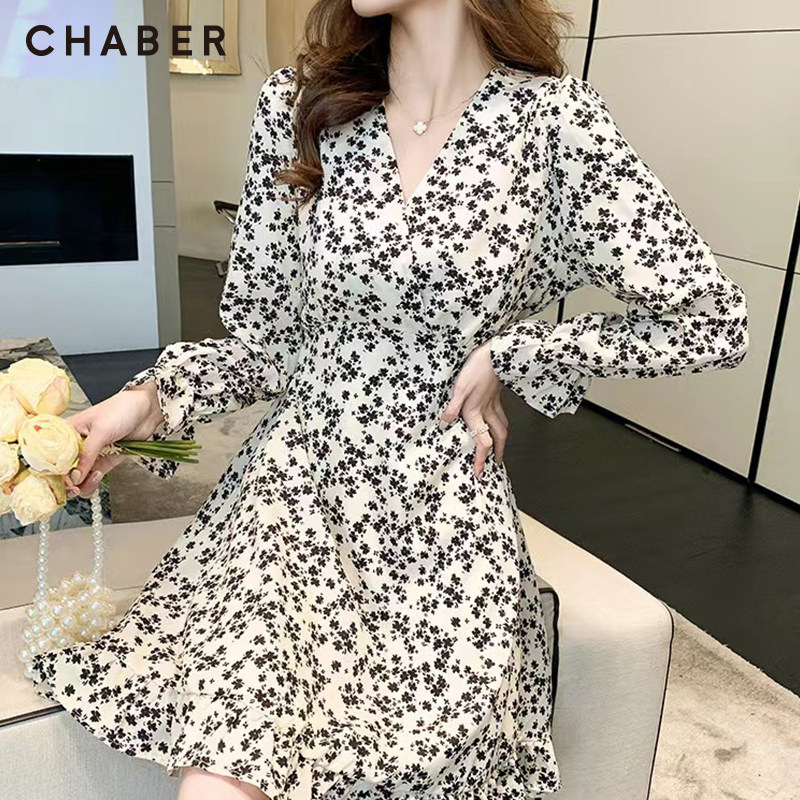 chaber长裙新款巧帛春季新品碎花V领高腰女装长袖中长款连衣裙