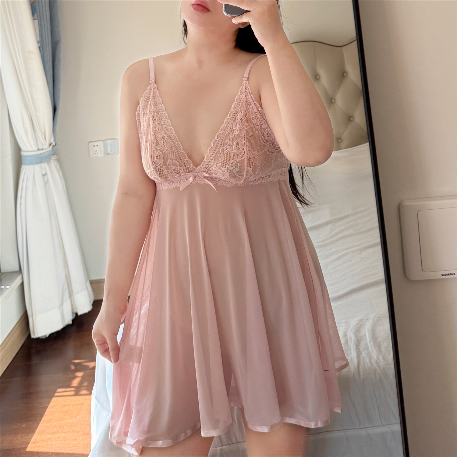 大码薄纱蕾丝V领吊带睡裙女胖mm私房透视火辣诱惑氛围感性感睡衣