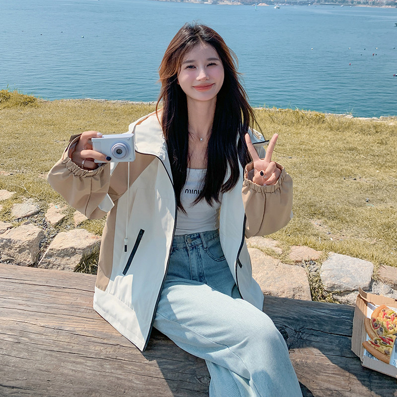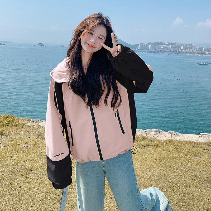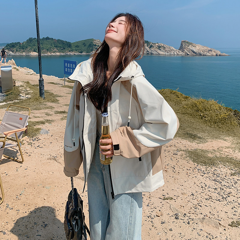 卡其色拼色连帽冲锋衣女2026年春季新款独特设计感工装风气质外套