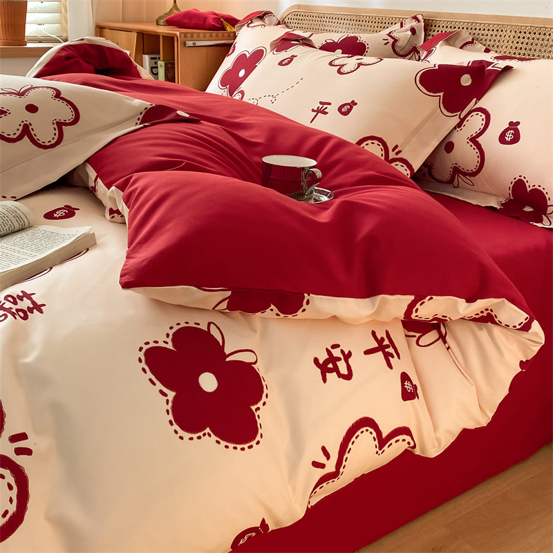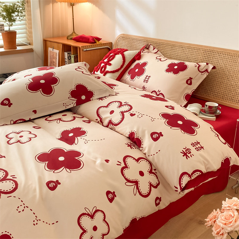 婚庆水洗棉喜庆四件套中式红牀单牀笠磨毛被套结婚房牀上用品