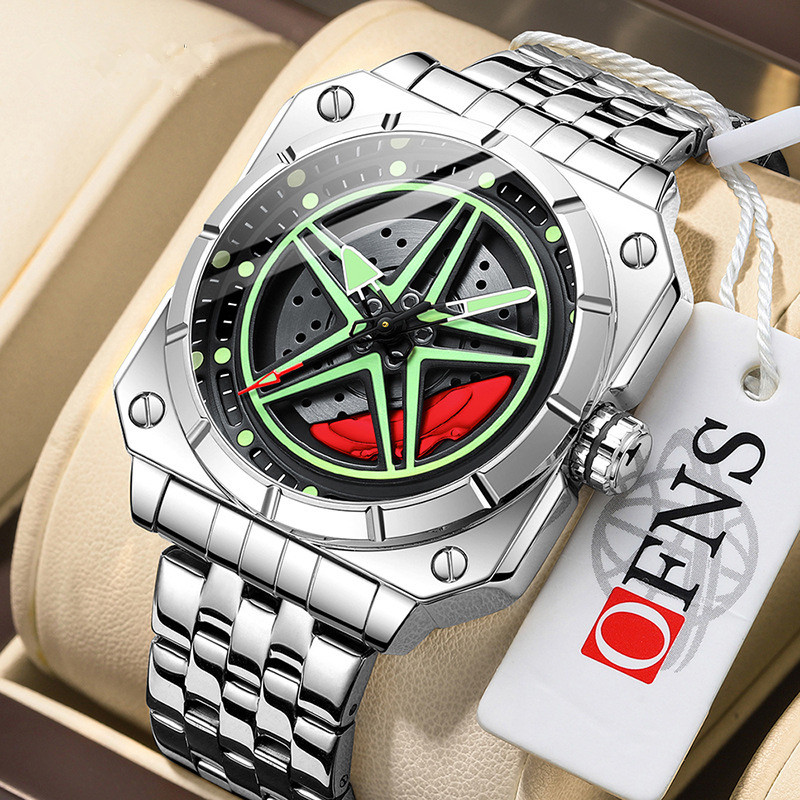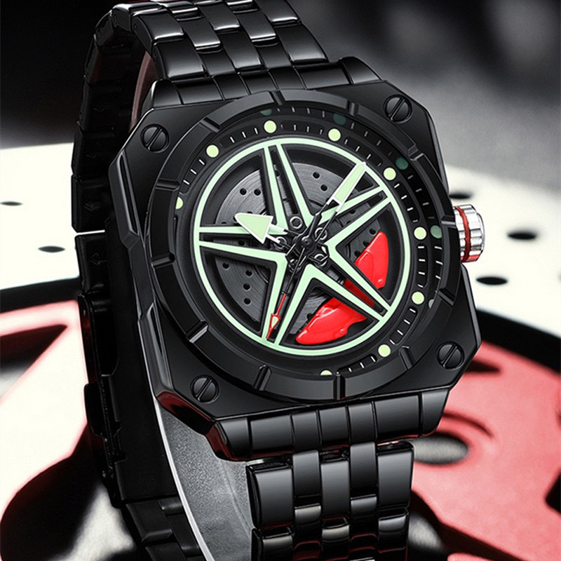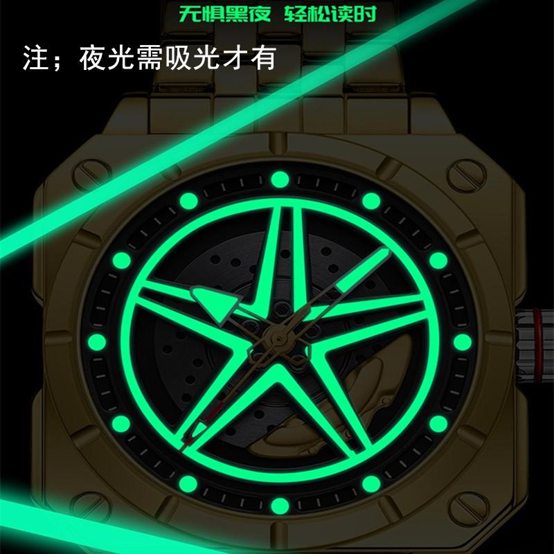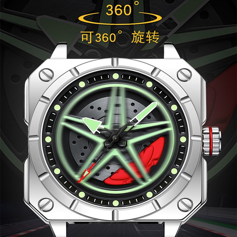 轮毂汽车旋转镂空五芒星防水夜光刹车TE卡钳37创意炫酷方形男手表