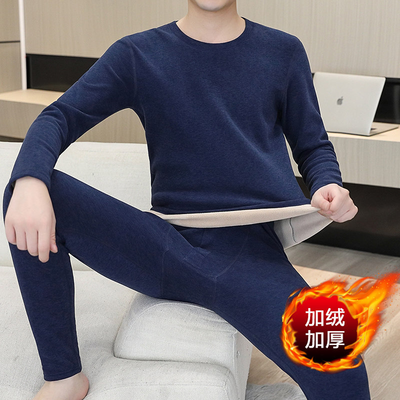男士冬季圆领保暖内衣加绒加厚中老年骆驼绒发热老人内穿打底套装