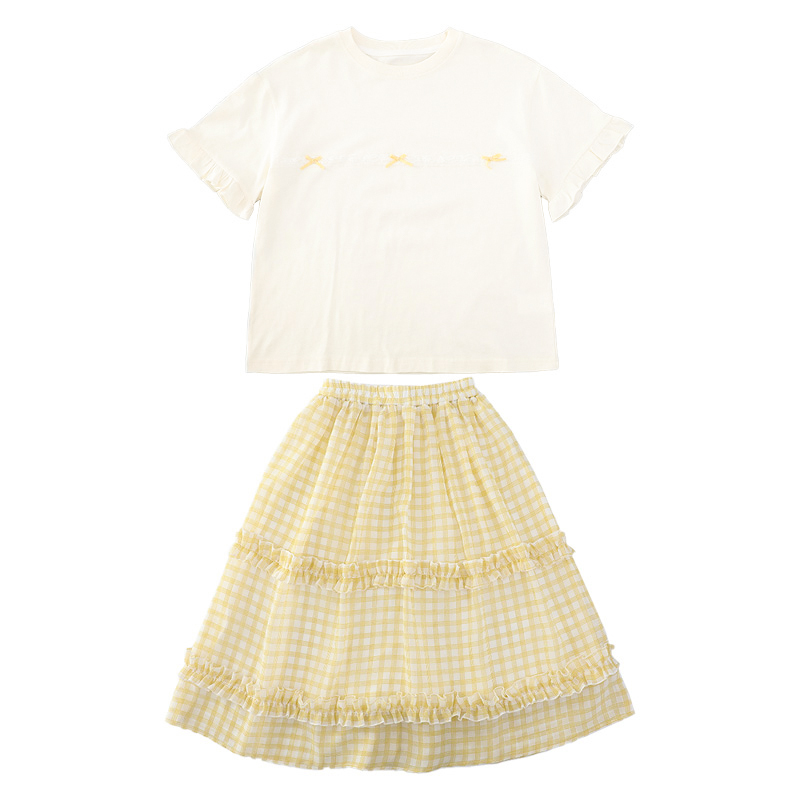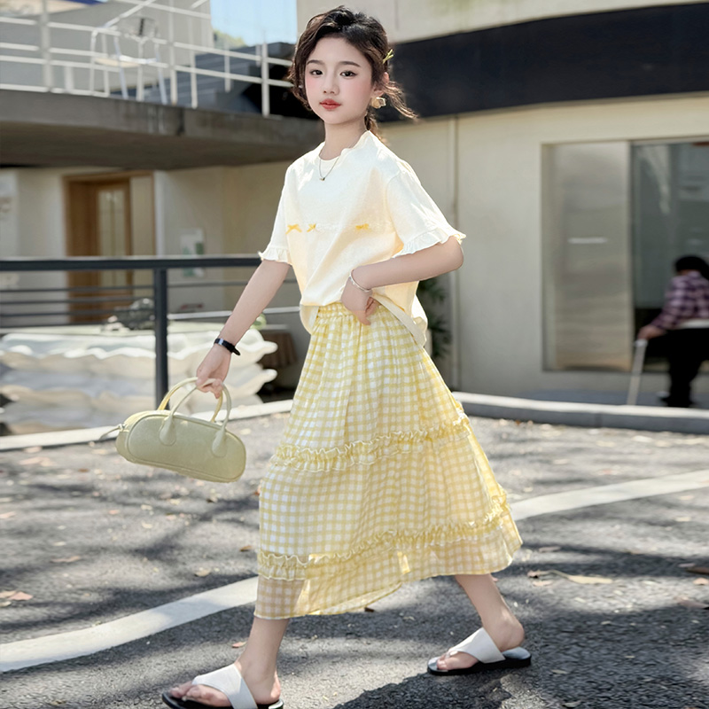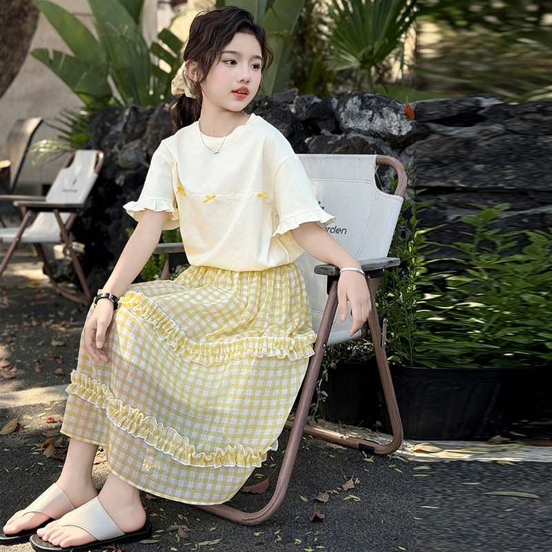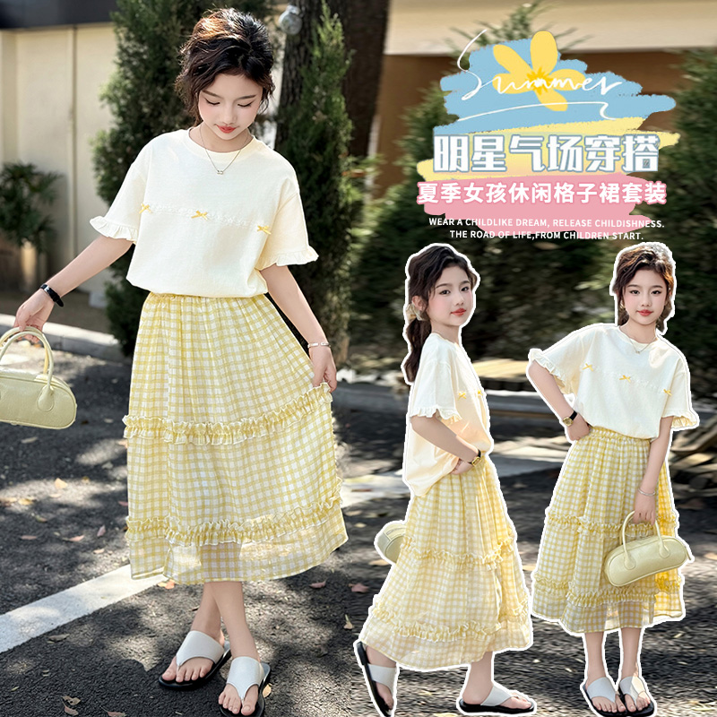 女童夏季套装2025新款夏装女孩纯棉花边袖Tt恤儿童半身裙两件套裙