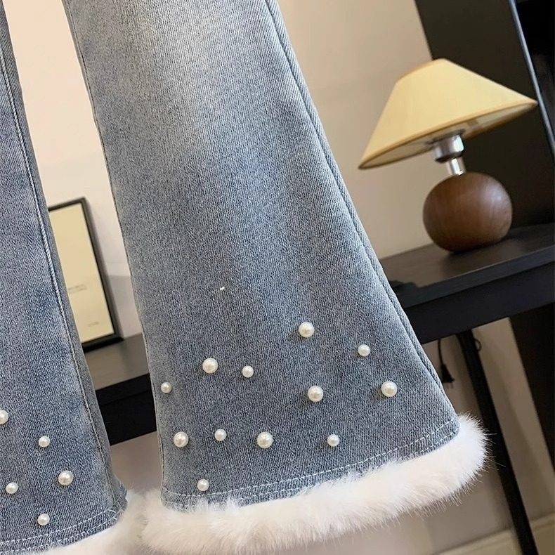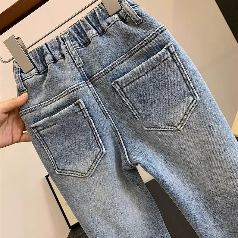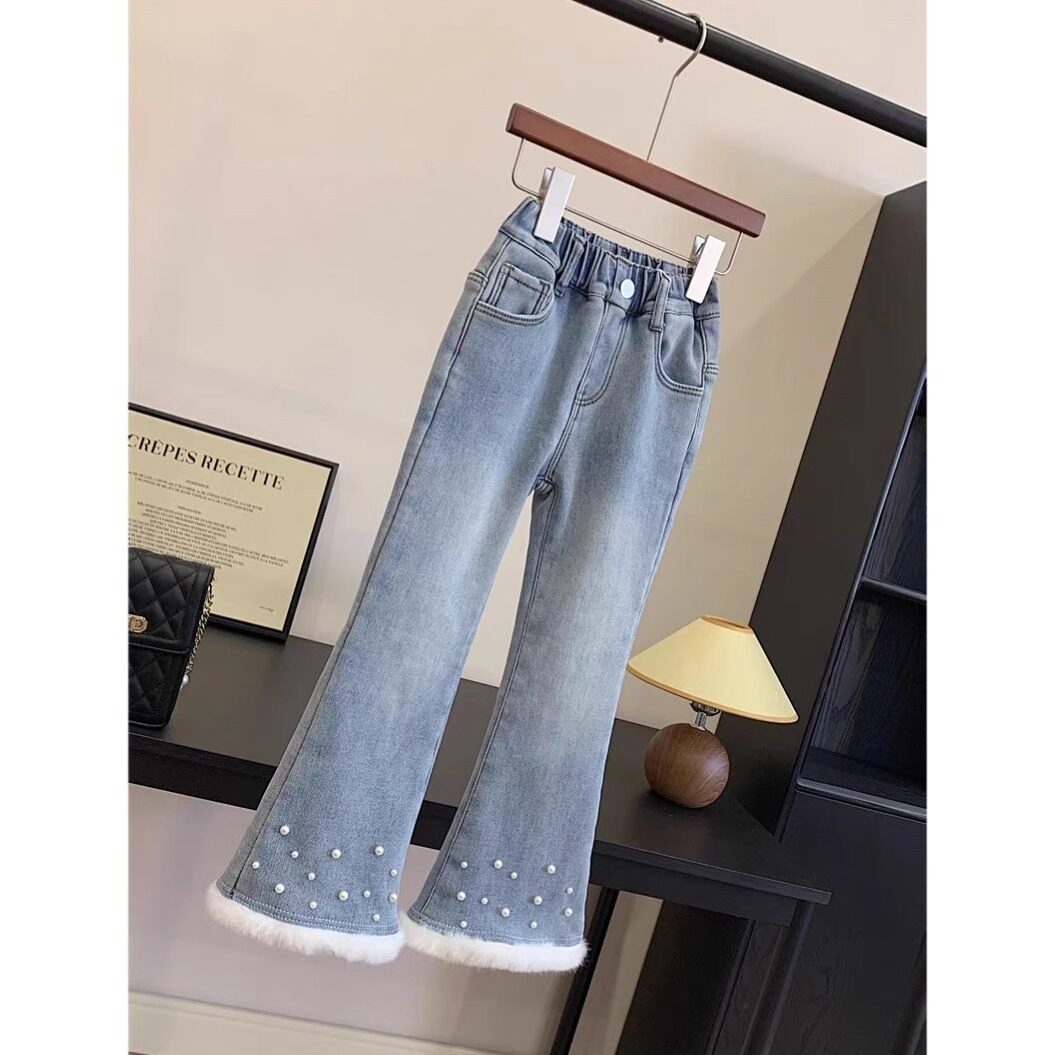 女中大童加绒喇叭裤冬季2025新款洋气儿童高腰一体绒加厚牛仔裤子