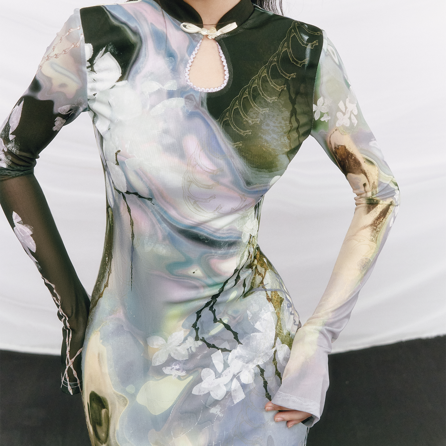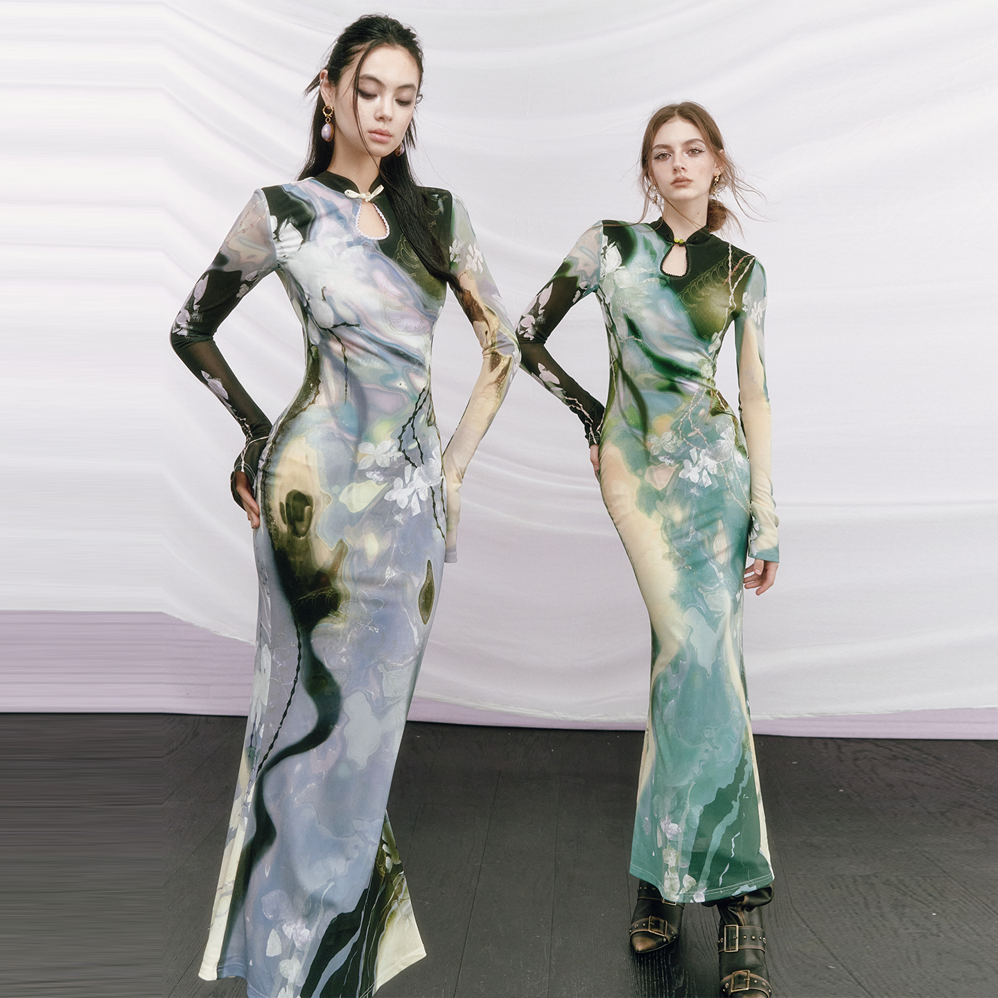 OfAkiva“金璎子”印象派原创印花旗袍连衣裙女高腰显瘦鱼尾长裙