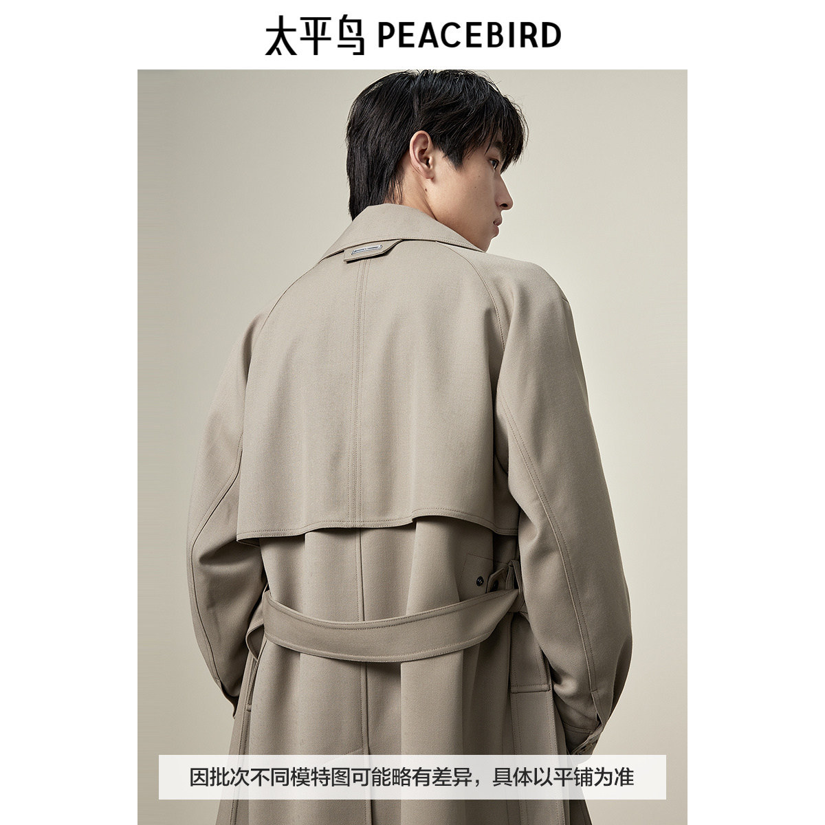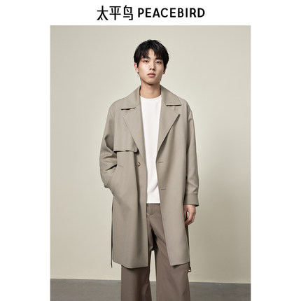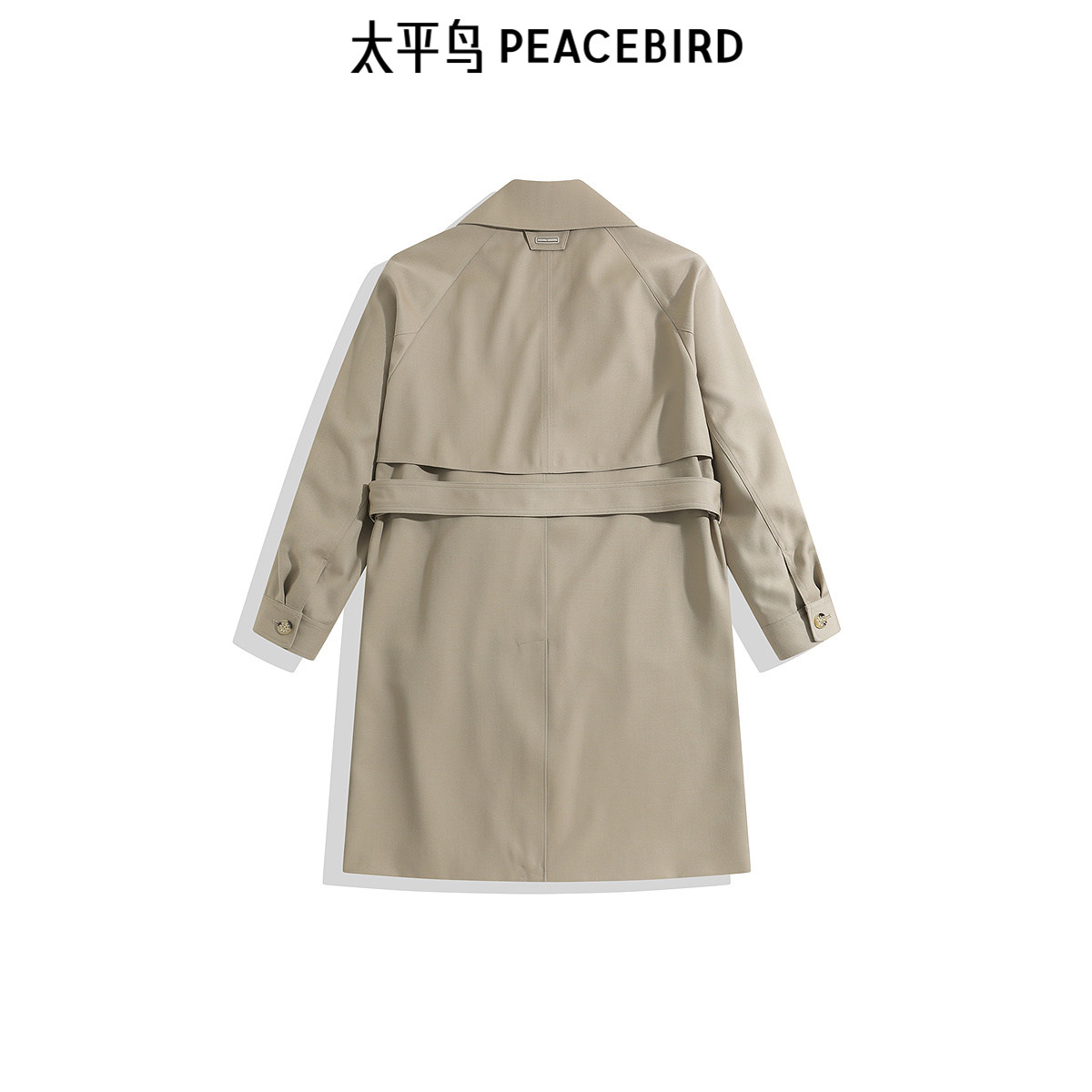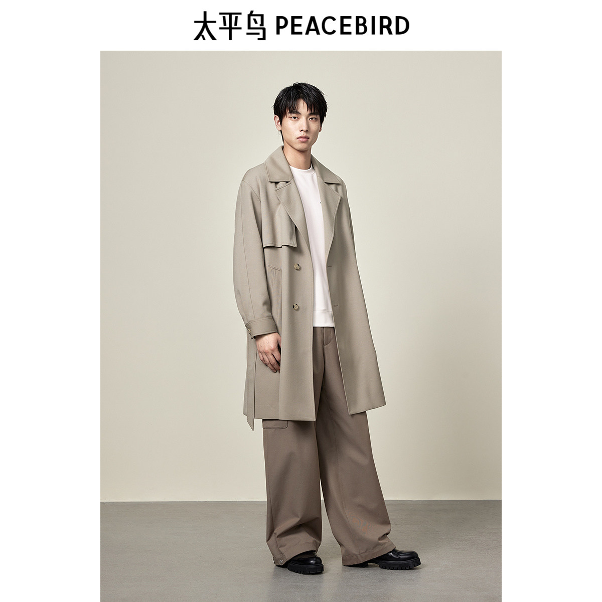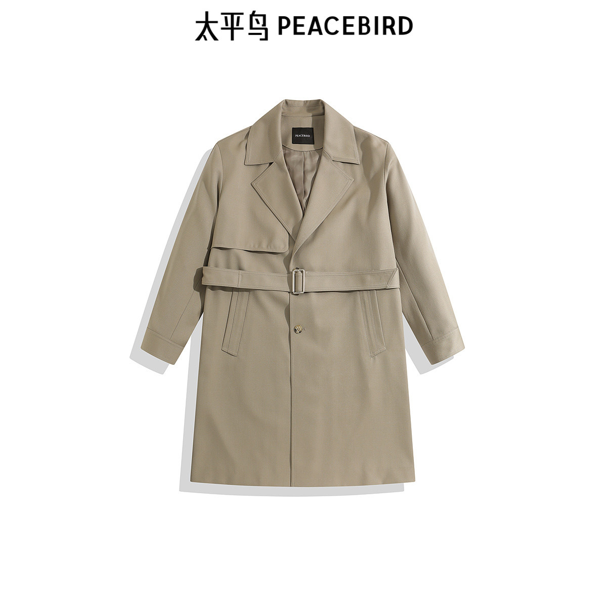太平鸟男装 可调节腰带翻领外套男秋季中长款羊毛棕色风衣男