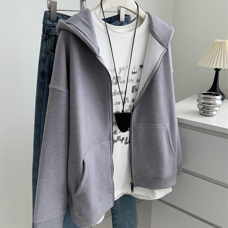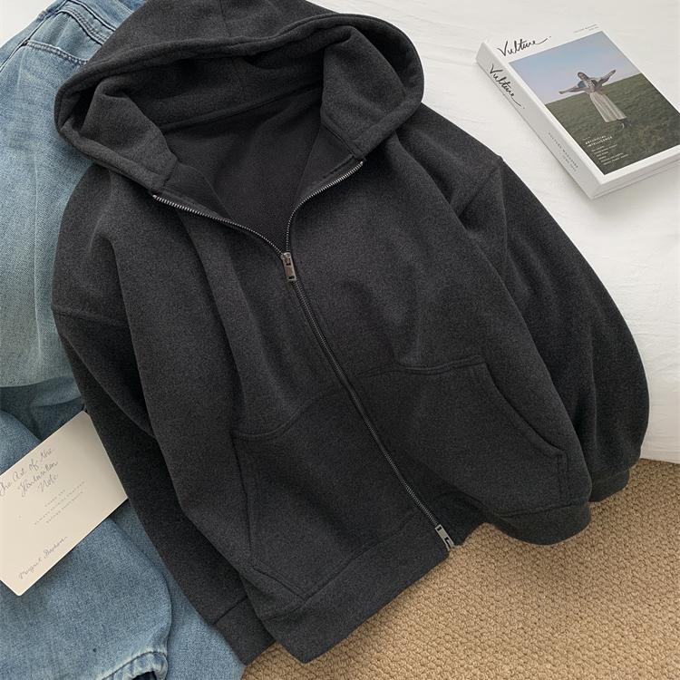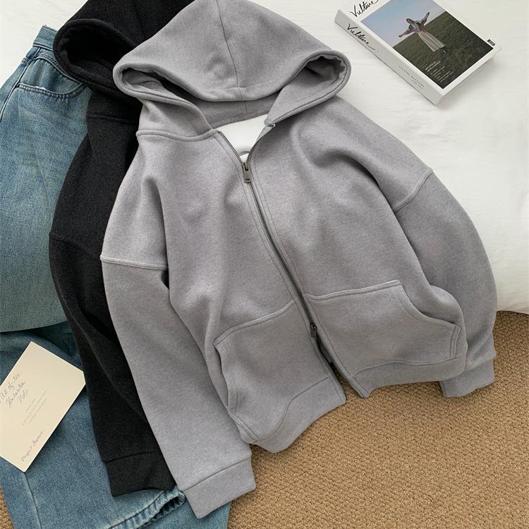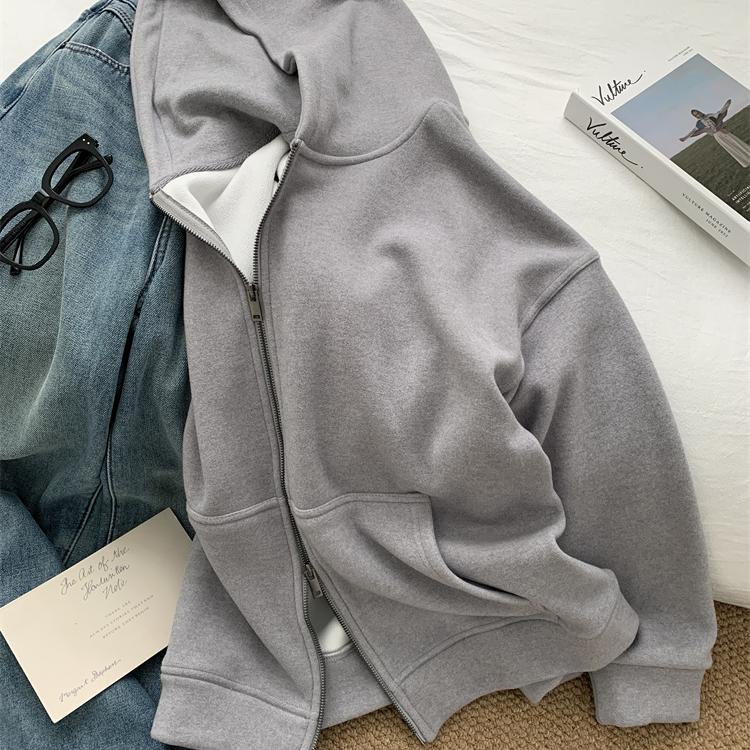 重磅磨毛拉绒卫衣外套女气质简约廓形双拉链连帽开衫冬季加厚上衣