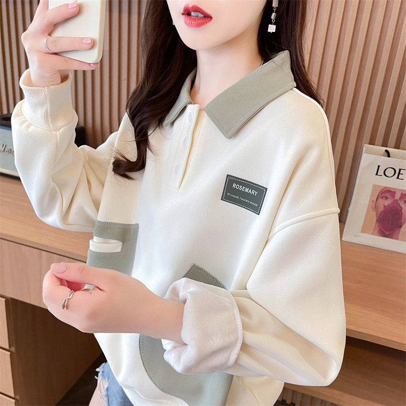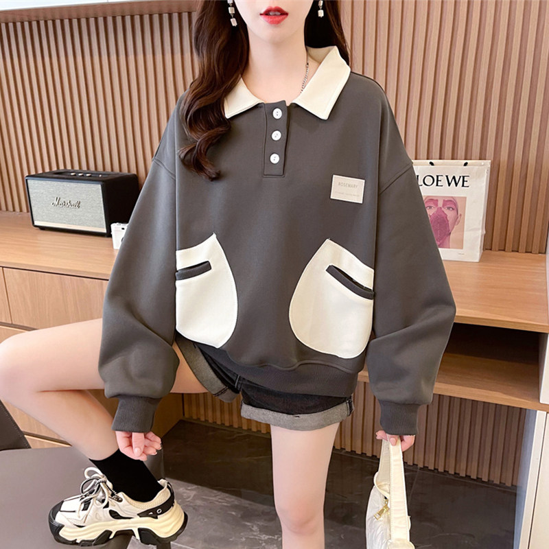 娃娃领卫衣女秋冬季韩版宽松大码加绒加厚小个子翻领撞色上衣外套