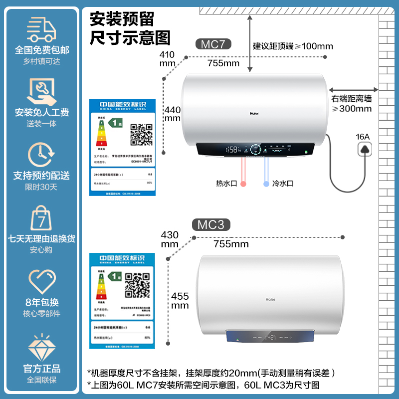 海尔官方电热水器MC3家用卫生间洗澡一级能效速热镁免MC7