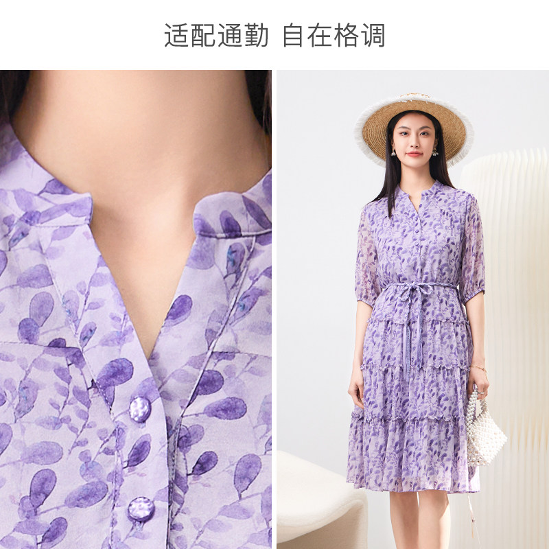 春竹夏季新款桑蚕丝小立领短袖碎花中长款舒适百搭真丝连衣裙女