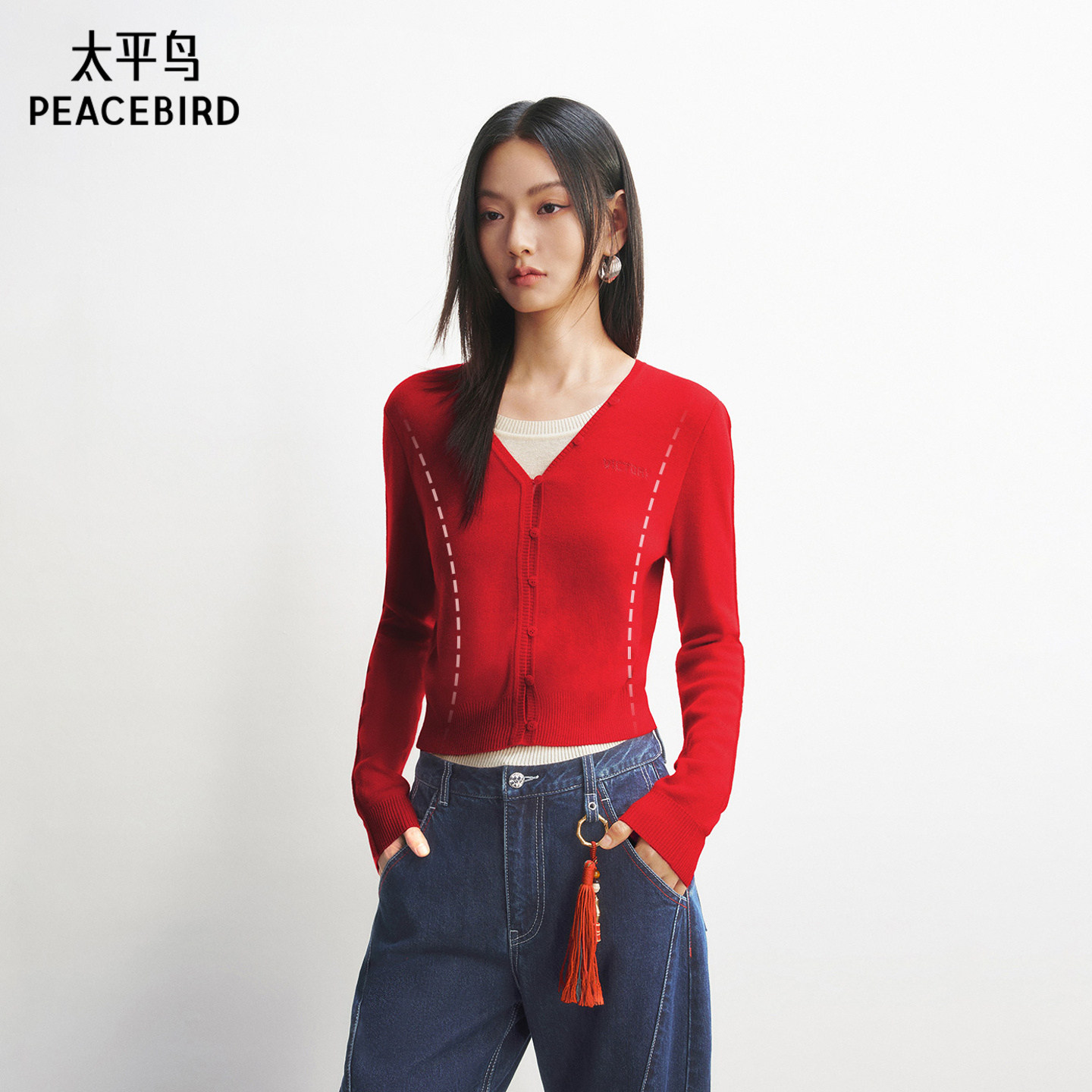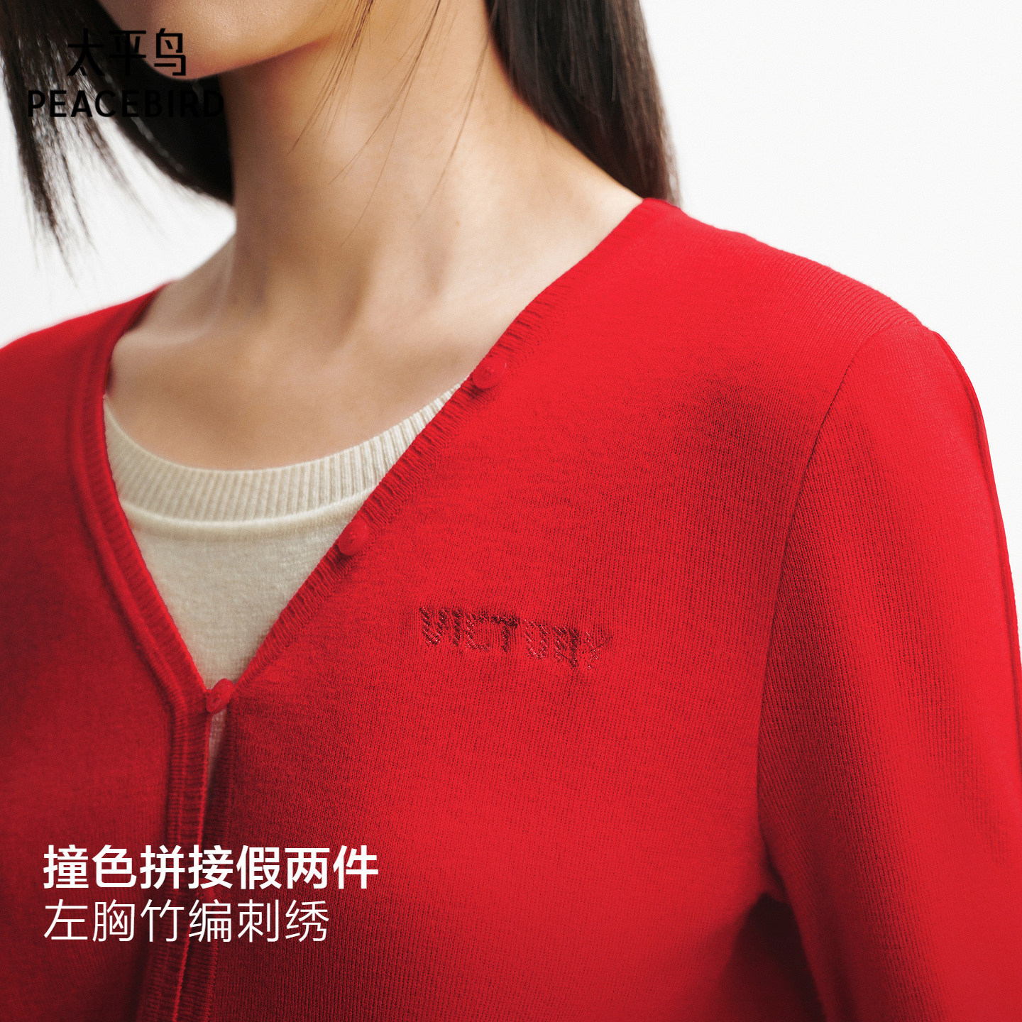 太平鸟假两件撞色新年红色针织衫