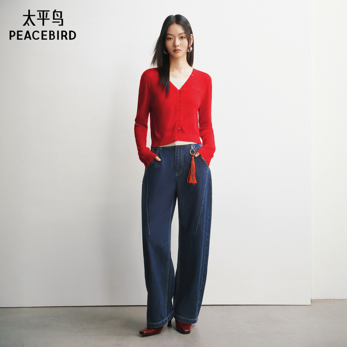 【商场同款】太平鸟羊毛混纺假两件撞色新年红色针织衫A3EEG1211
