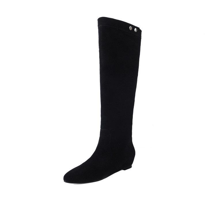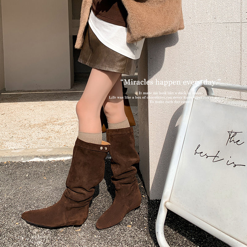 5cm真皮复古磨砂绒面小个子显瘦堆堆靴2025方头内增高百搭长靴女