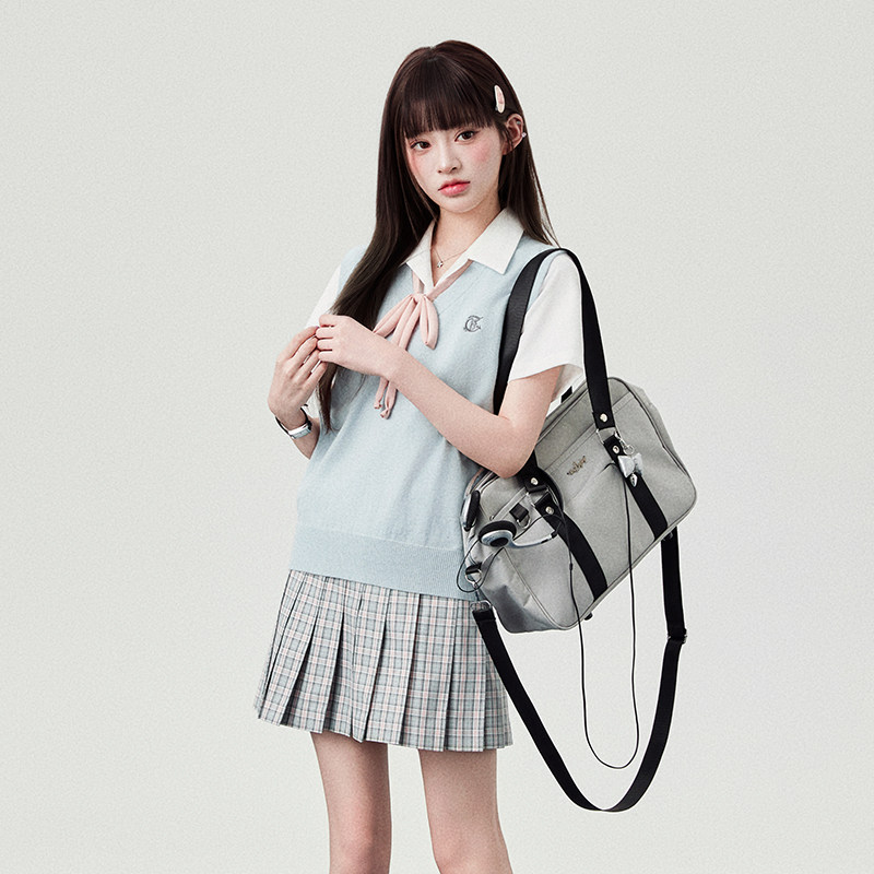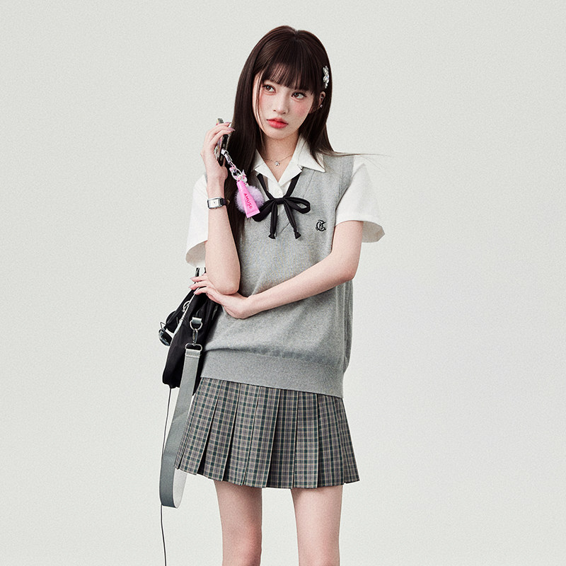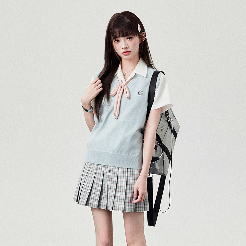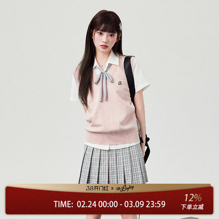 花铃太太jk制服哲之道针织马甲春学院风女百褶裙粉色毛衣背心套装