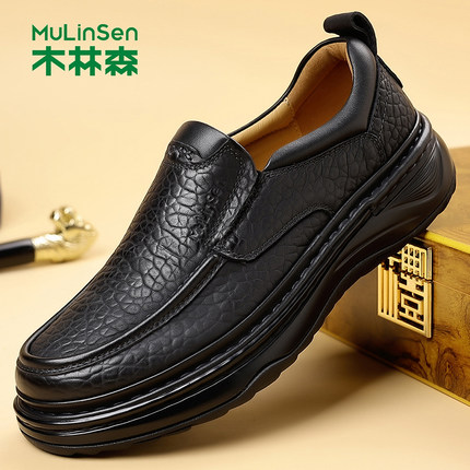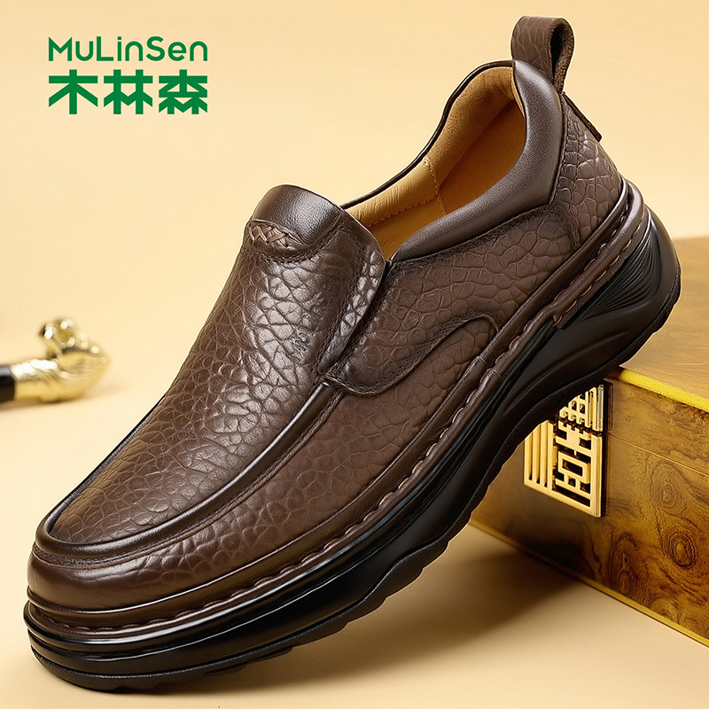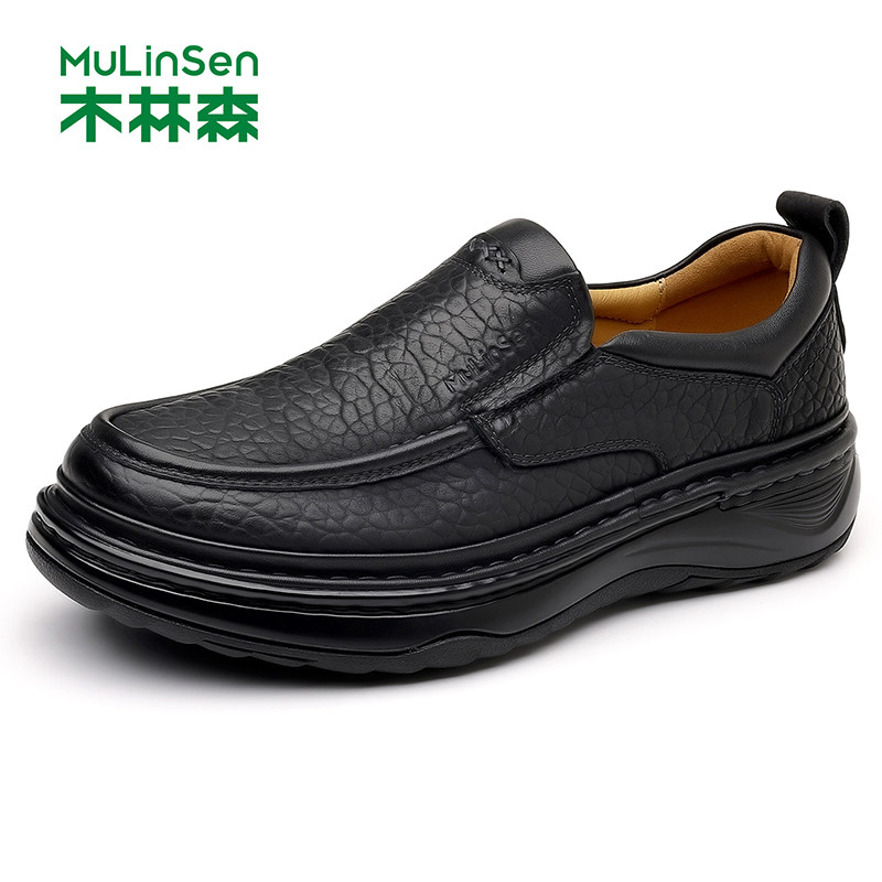 木林森男士休闲皮鞋头层牛皮手工缝线厚底爸爸鞋百搭耐磨春秋防滑