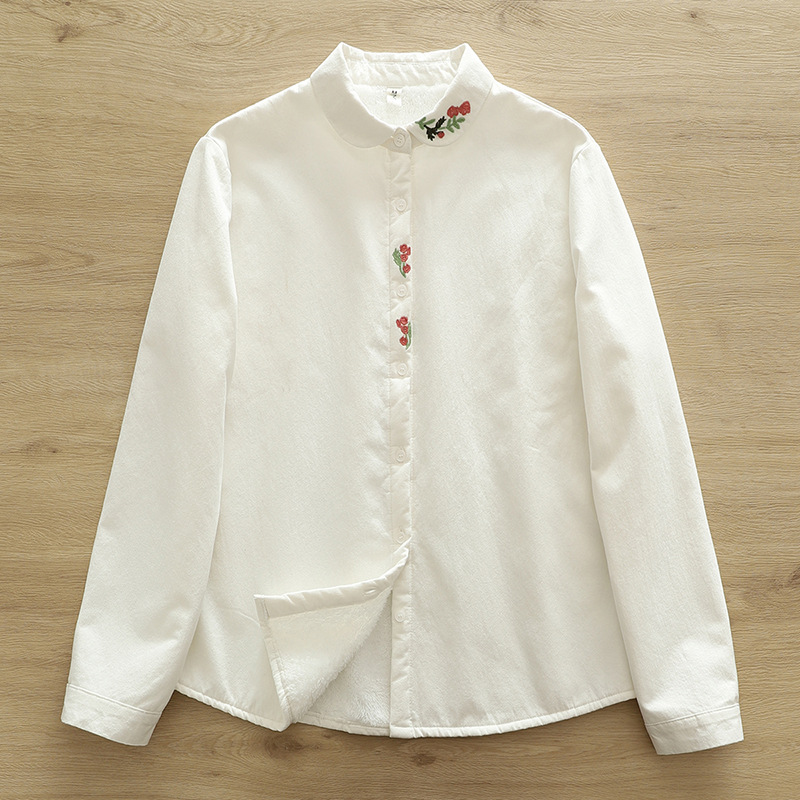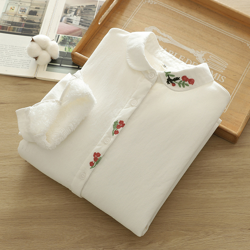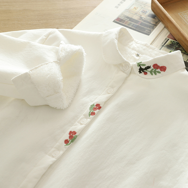 磨毛纯棉加绒衬衫女秋冬小清新文艺刺绣百搭打底保暖加厚白色衬衣