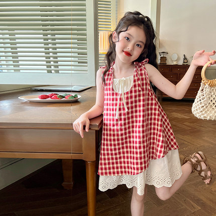 栀了成长记童装女童红色格子纯棉连衣裙夏季新款儿童女宝宝背心裙