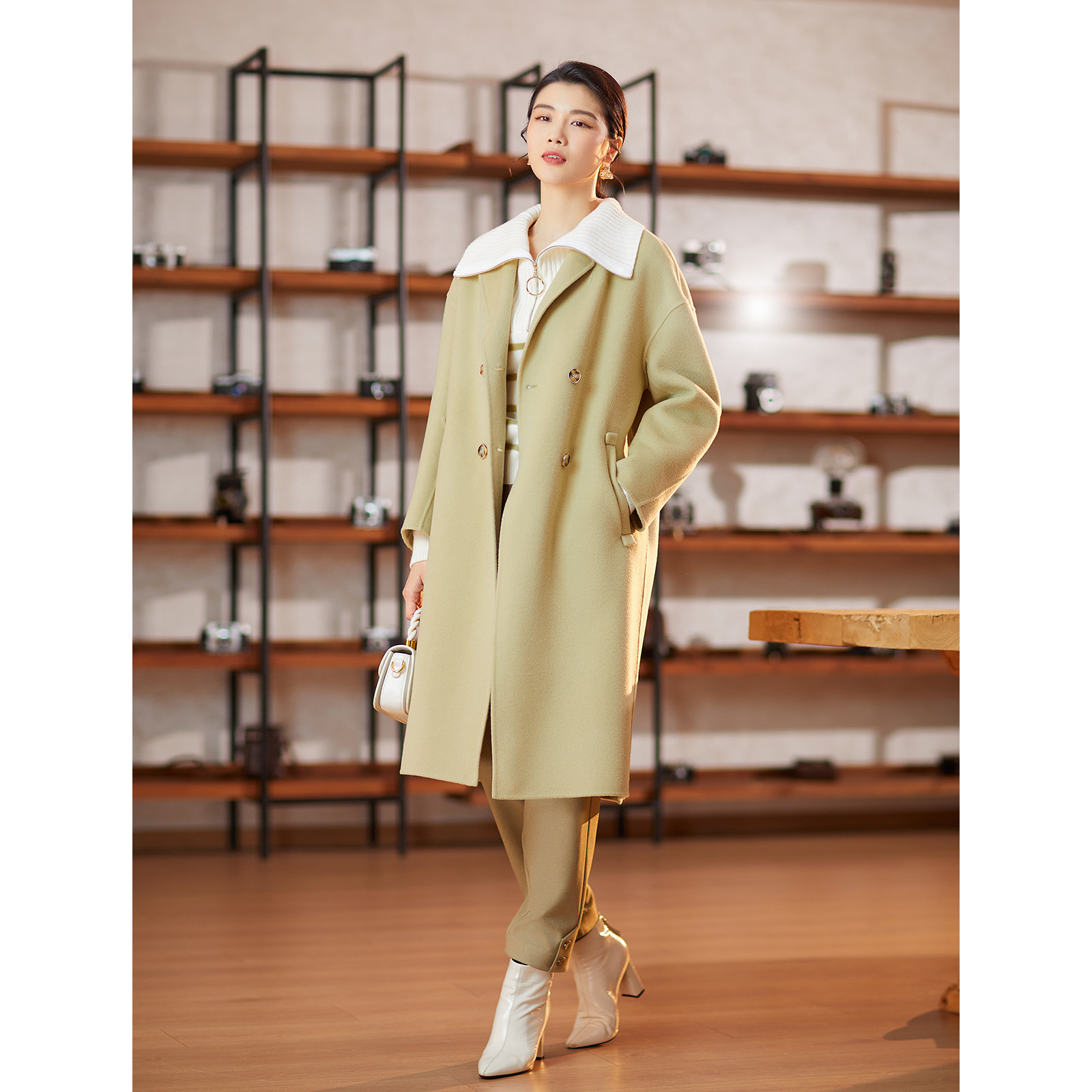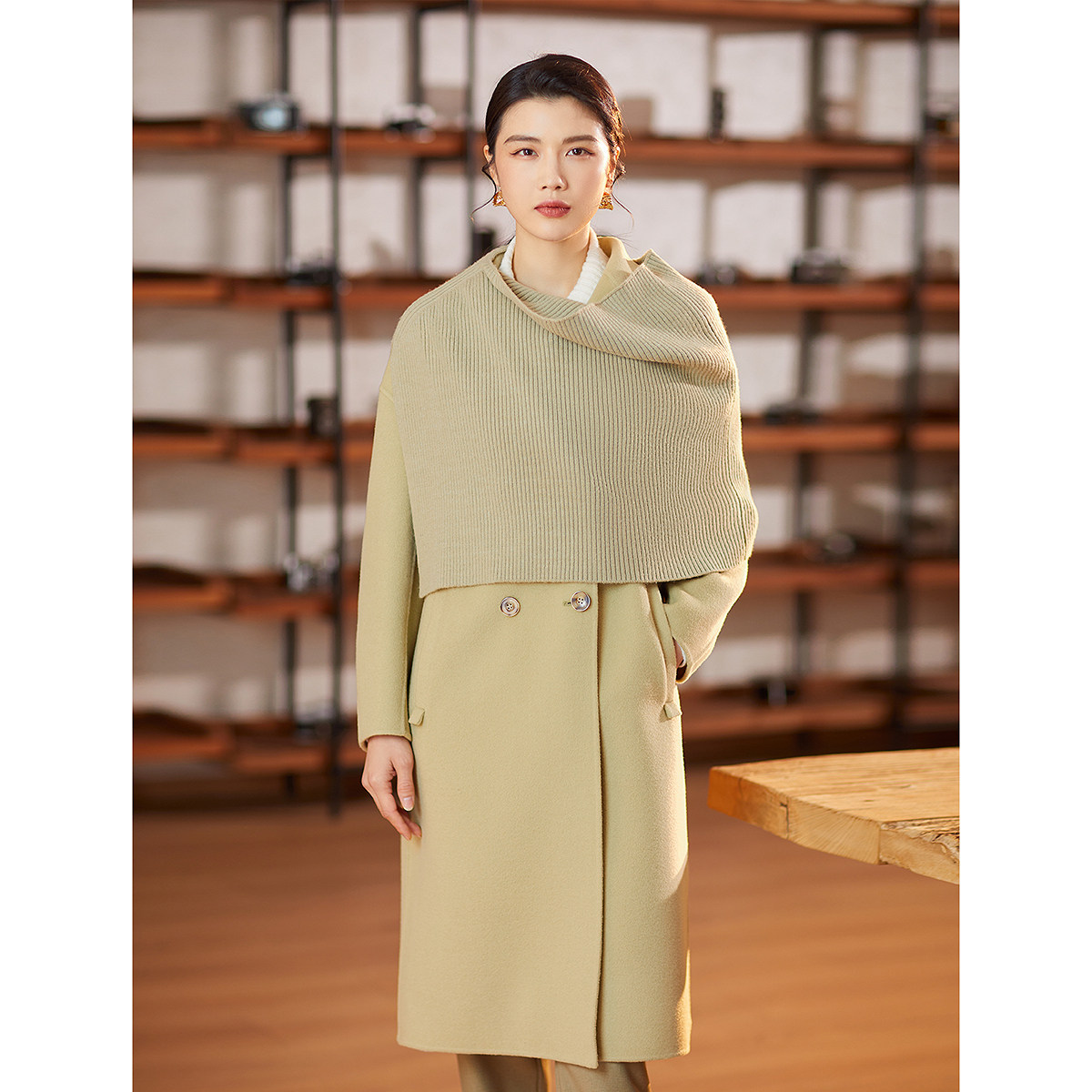 【围巾领大衣商场同款】BBLLUUEE粉蓝衣橱冬装多功能全羊毛外套女