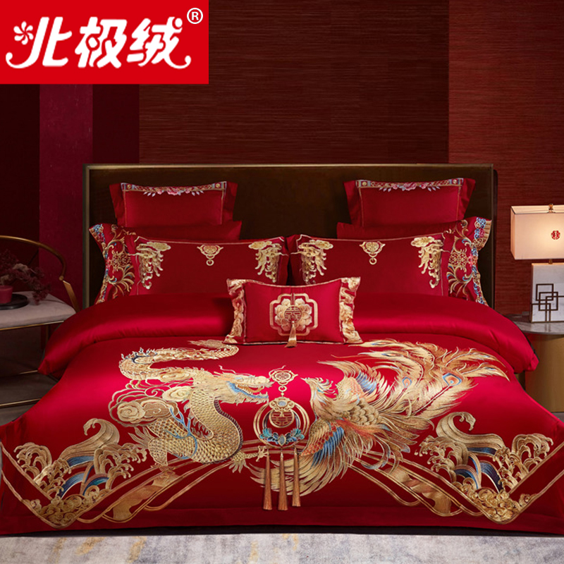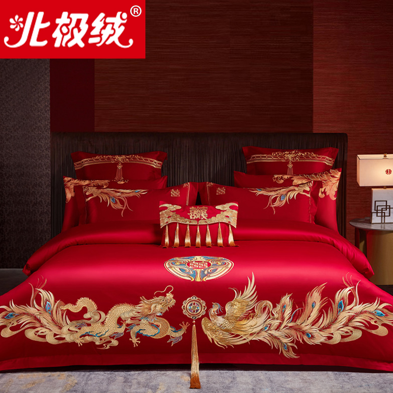 全棉婚庆四件套新婚龙凤刺绣纯棉大红色陪嫁高端结婚床上用品床品