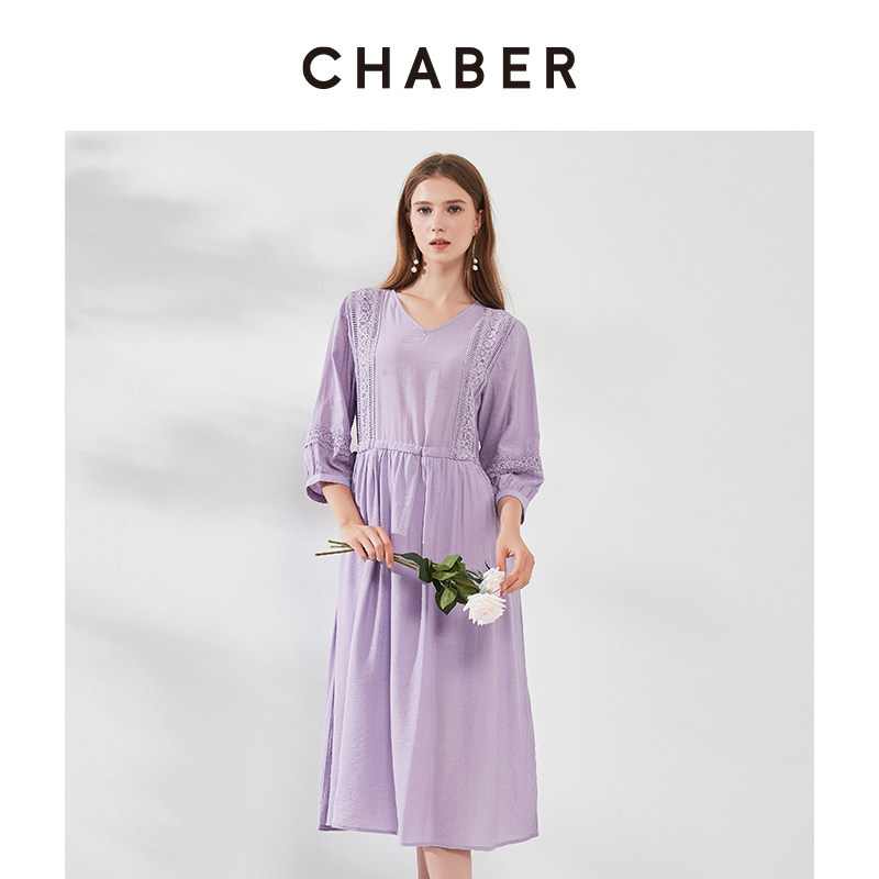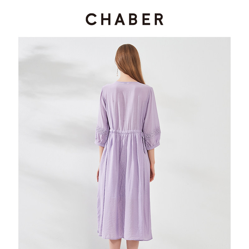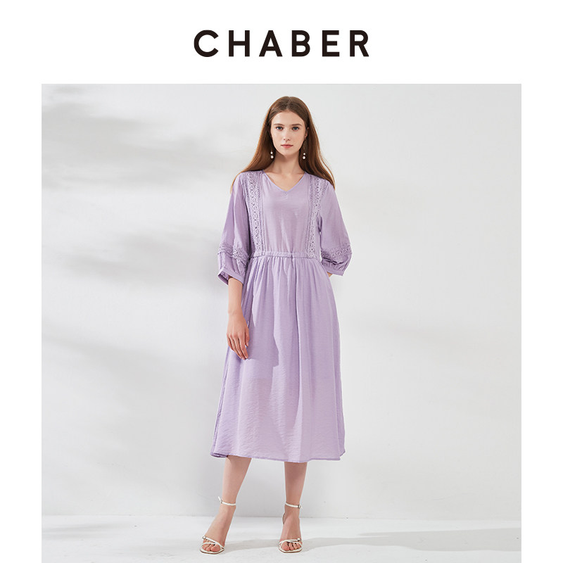 chaber巧帛夏季新款休闲宽松优雅气质蕾丝精致显瘦纯色V领连衣裙