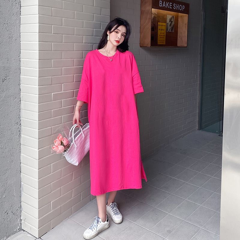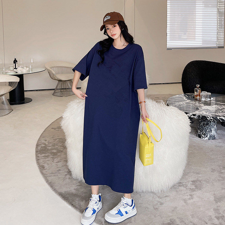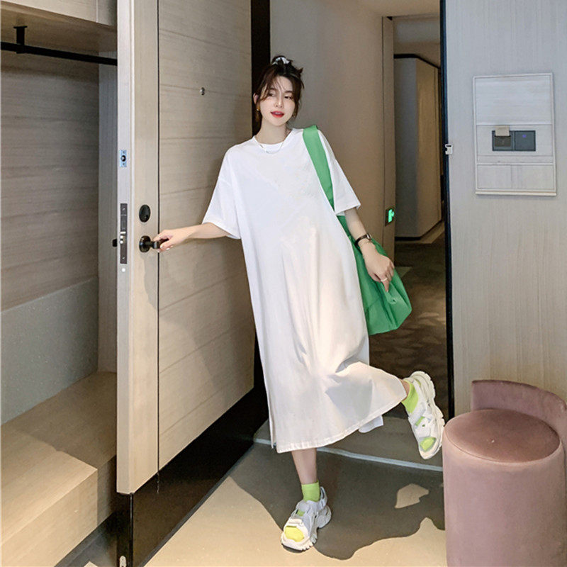 纯色开叉休闲连衣裙女夏季2025新款宽松大码中长款过膝短袖t恤裙