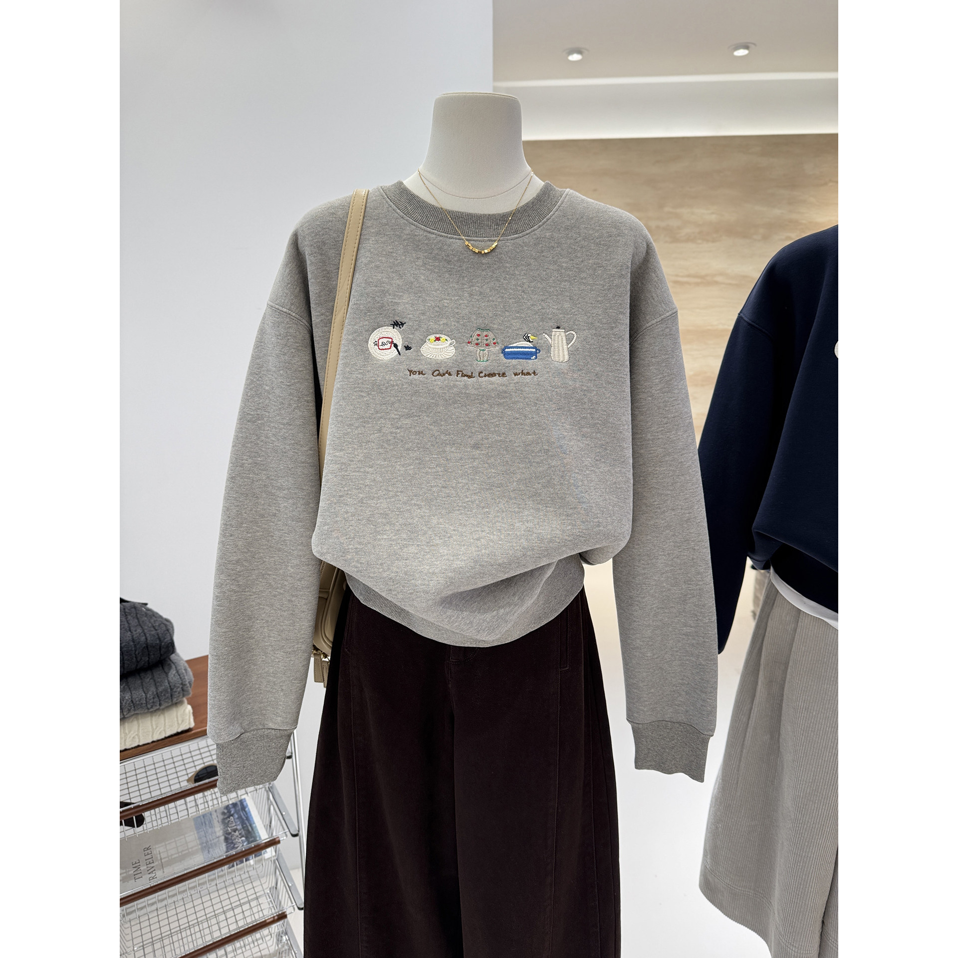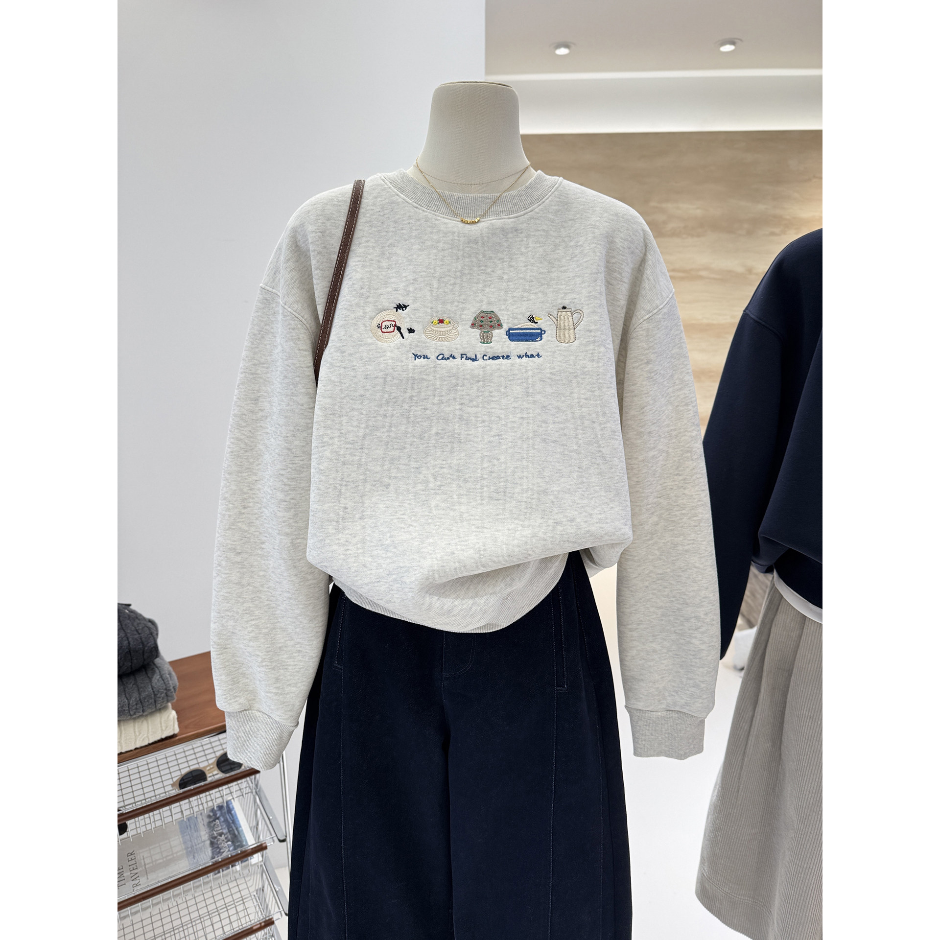 刺绣秋冬宽松加绒加厚圆领卫衣女