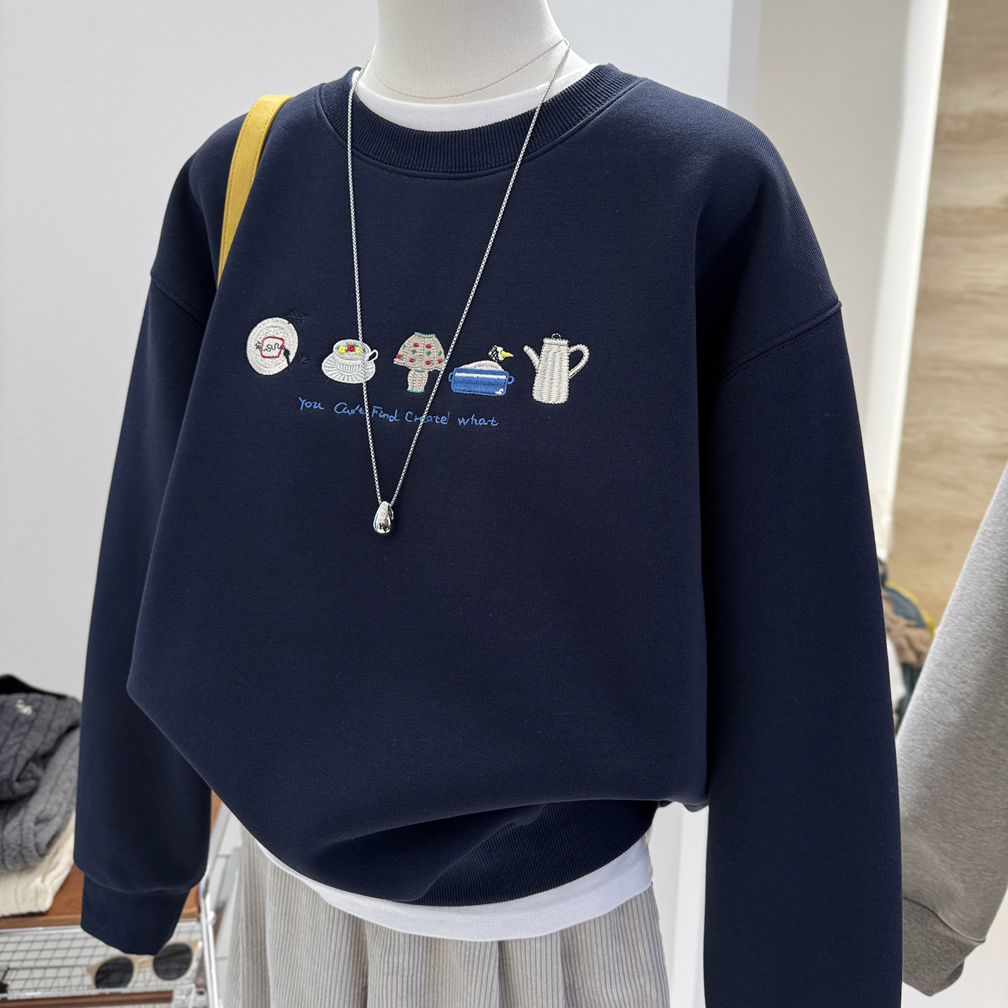 刺绣重磅棉秋冬新款韩系慵懒简约保暖宽松加绒加厚圆领套头卫衣女