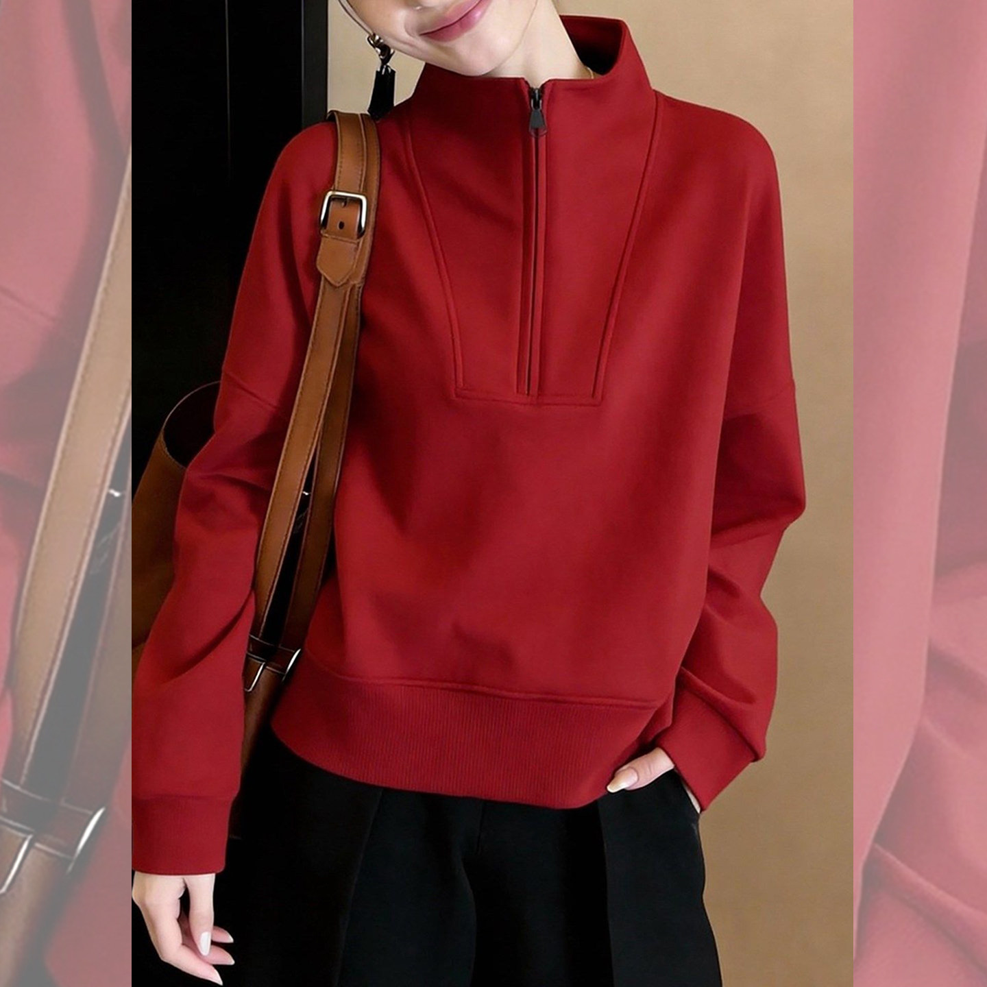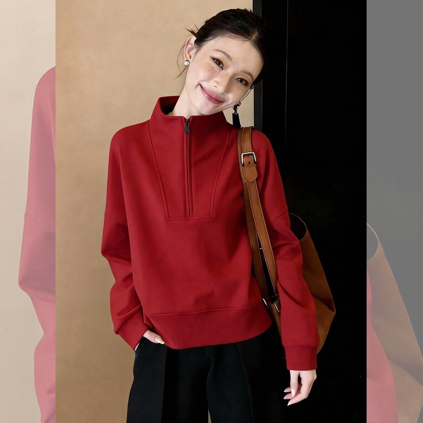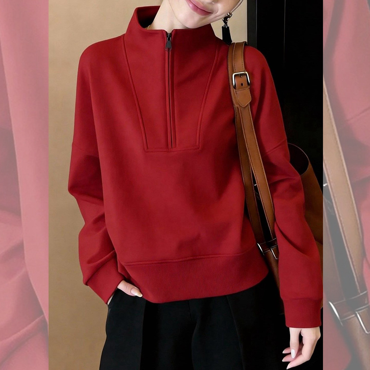 暖飒红调~半拉链立领红色卫衣女