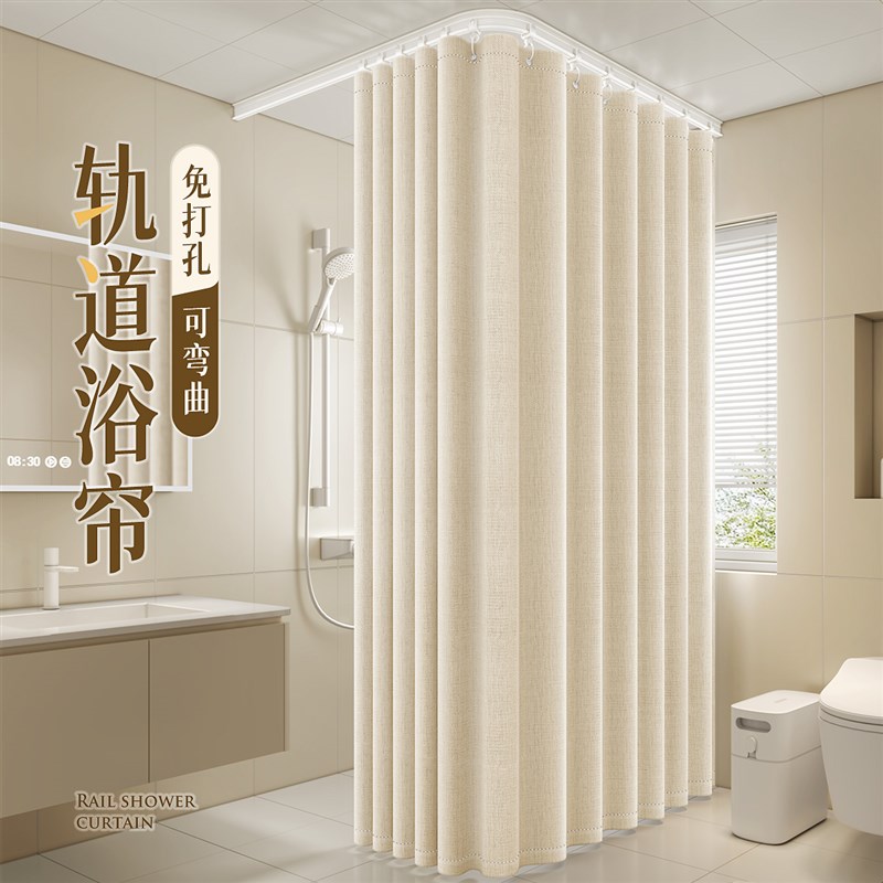 浴室弧形浴帘轨道防水布套装加厚隔断帘卫生间V淋浴免打孔U形