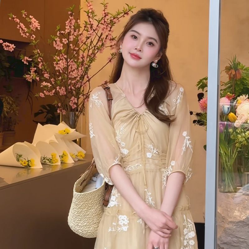 Basic House/百家好夏季新款气质刺绣优雅时尚百搭短袖连衣裙女