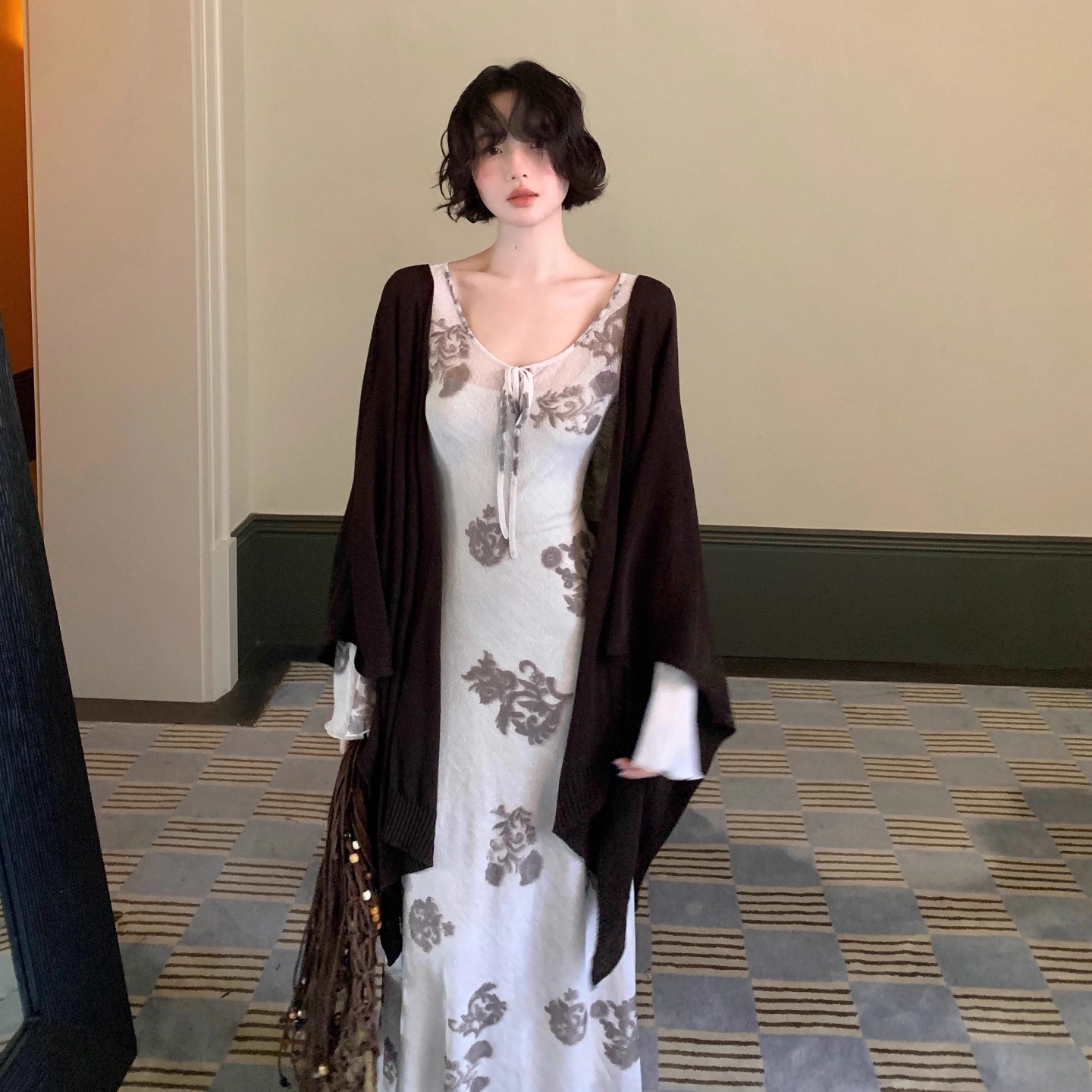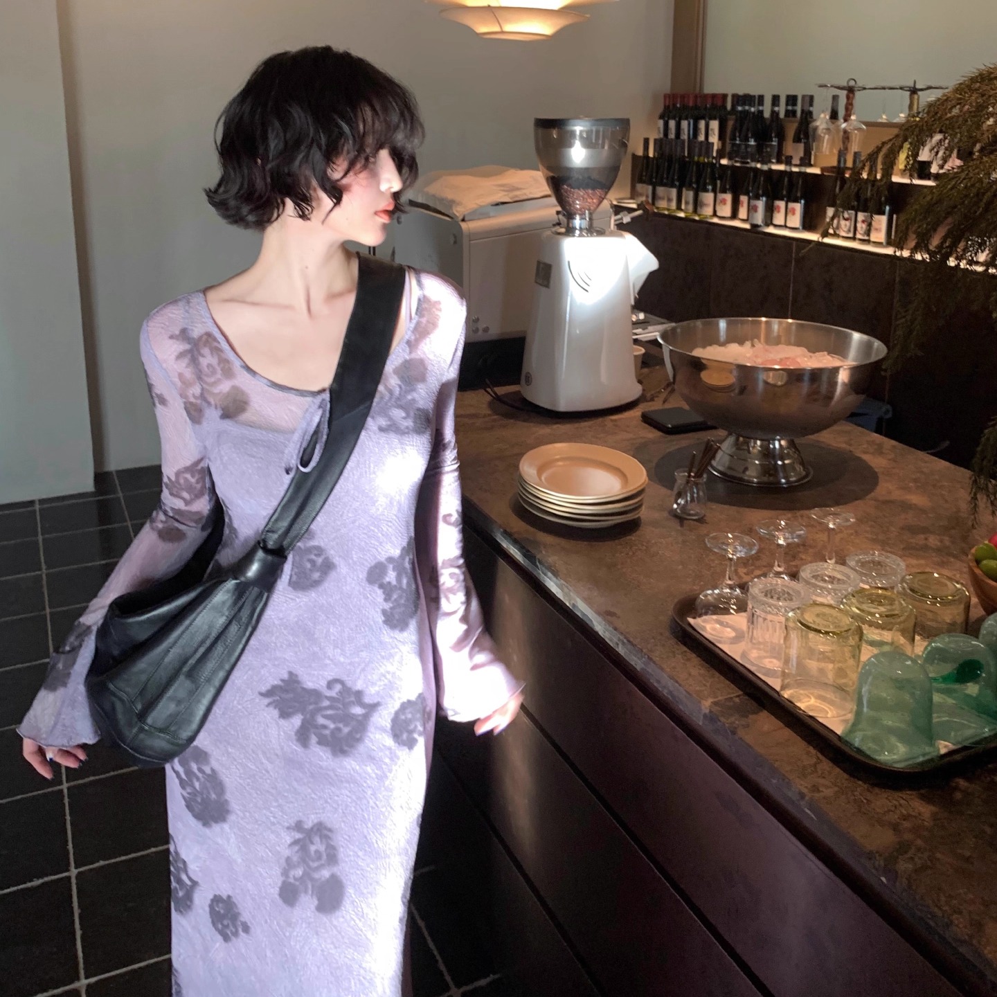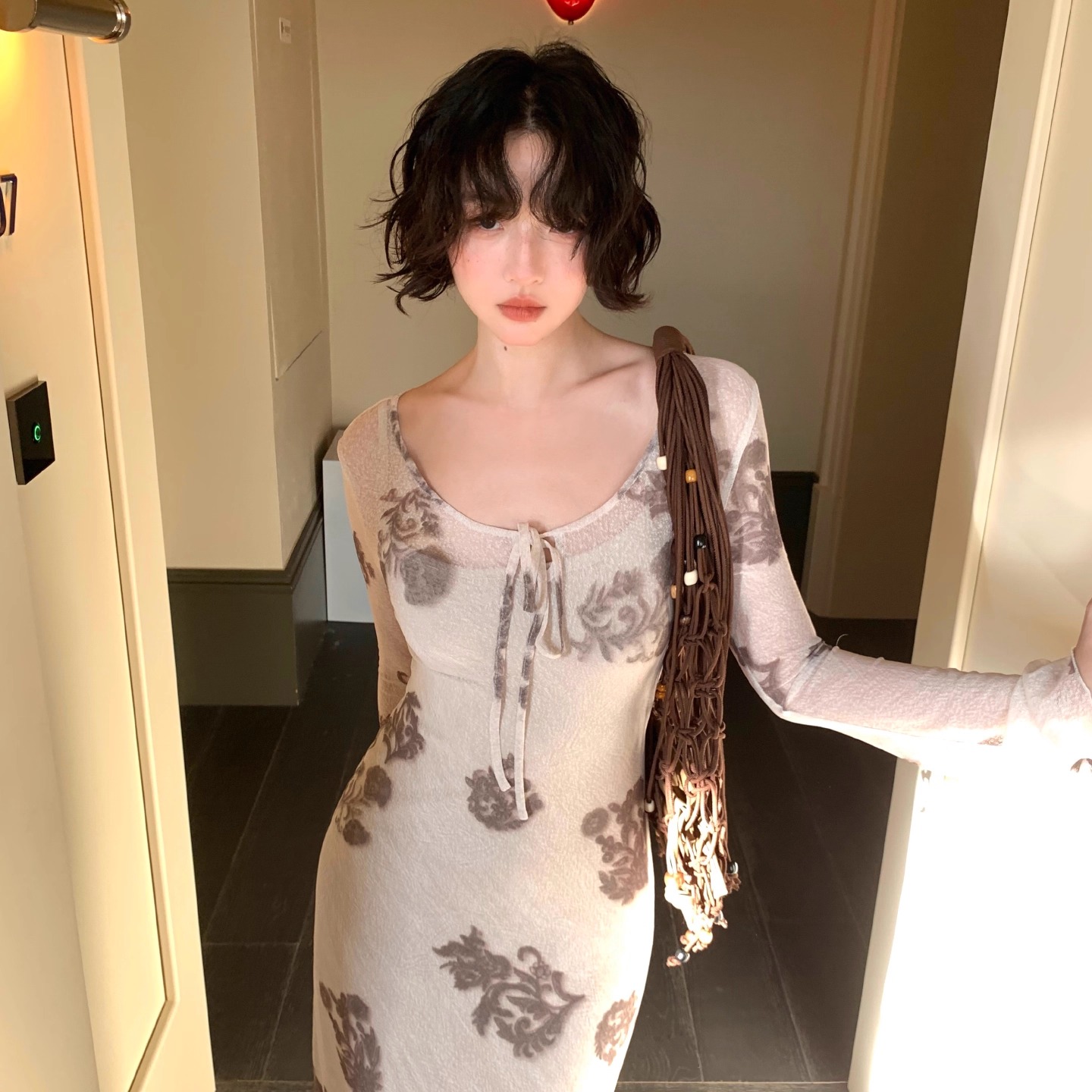 酒午自制【秋藤与杏】港风复古2025秋季新款长款亚麻网印花连衣裙
