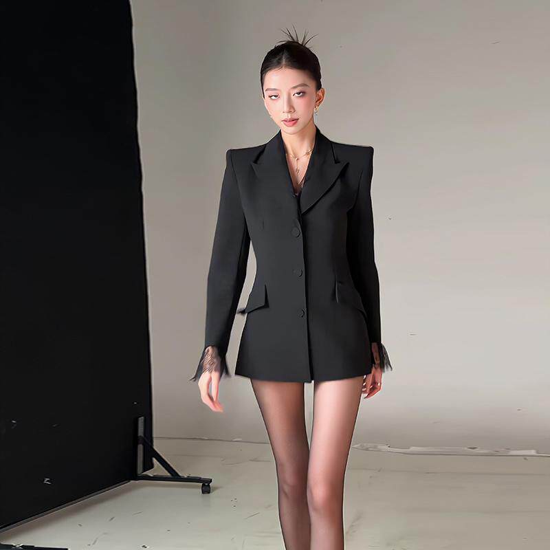 今年流行秋季御姐时尚黑色高级感蕾丝拼接性感收腰单排扣西装外套