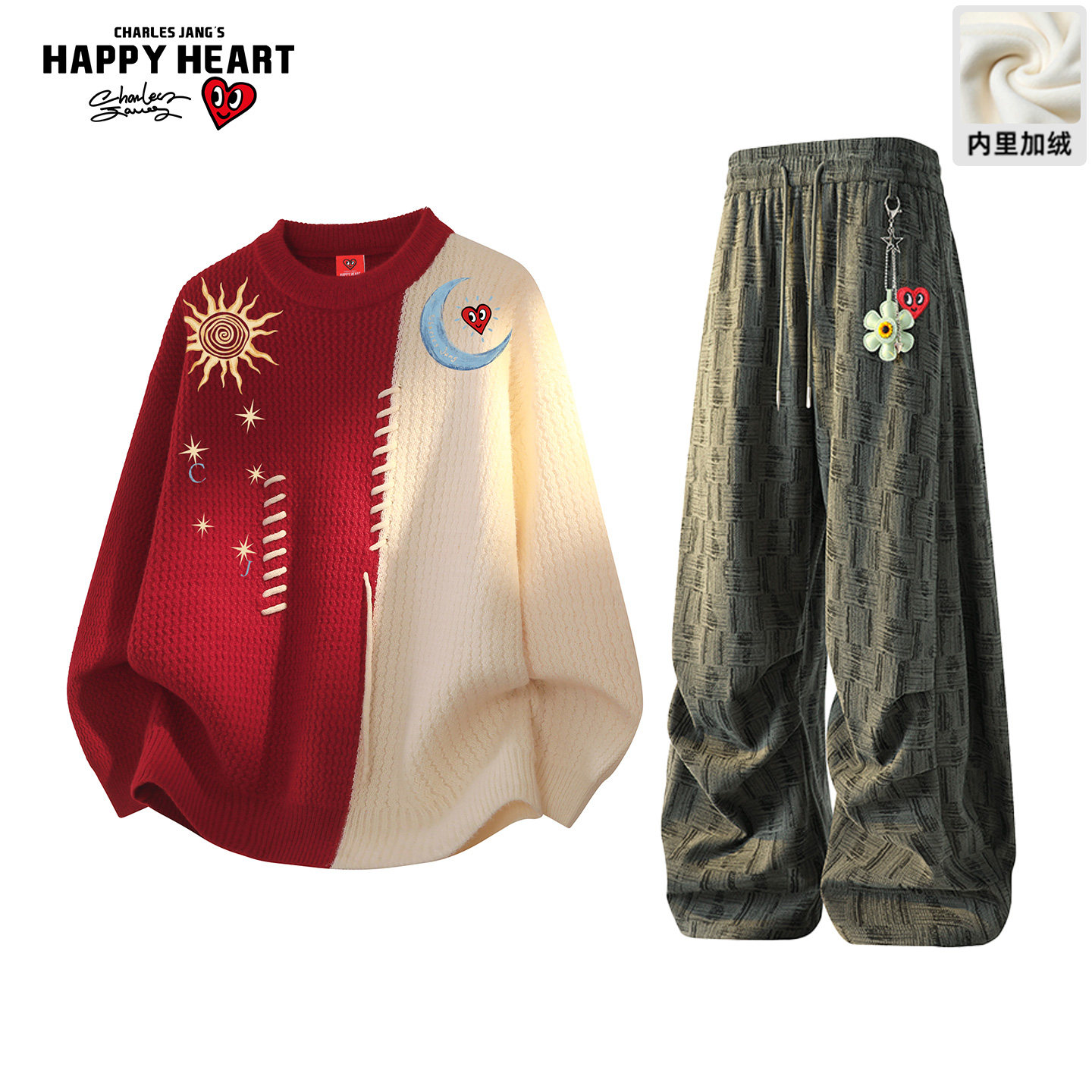 查尔斯桃心拼色抽绳圆领毛衣套装男冬季加绒加厚直筒休闲裤两件套