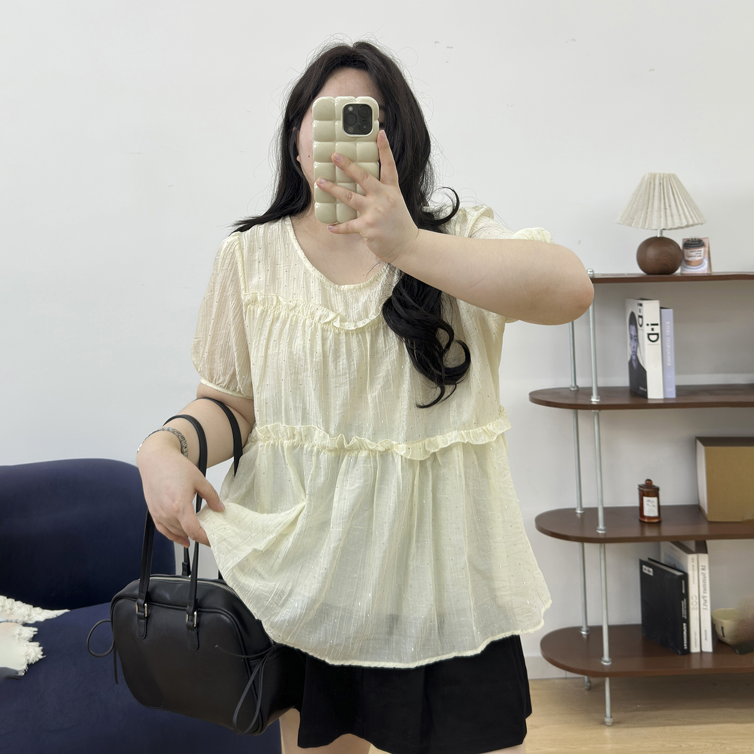 宛宛大码女装黑色烫钻波点木耳边长袖衬衫2025秋季胖mm遮肚上衣