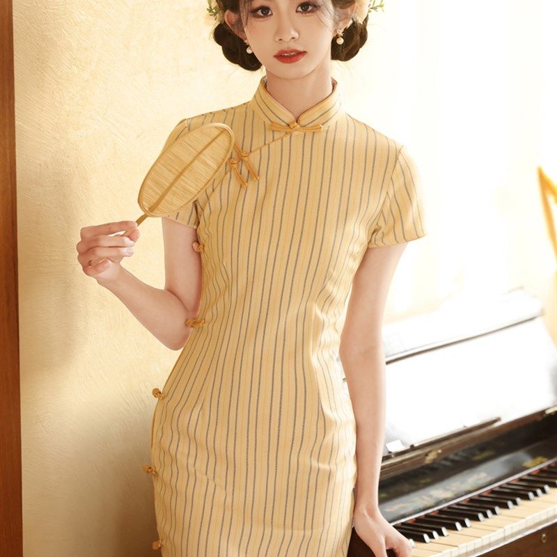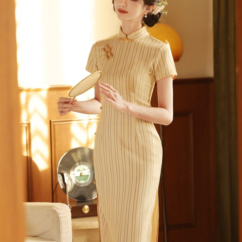 黄色条纹旗袍2024春夏复古民国风文艺少女大学生长款连衣裙