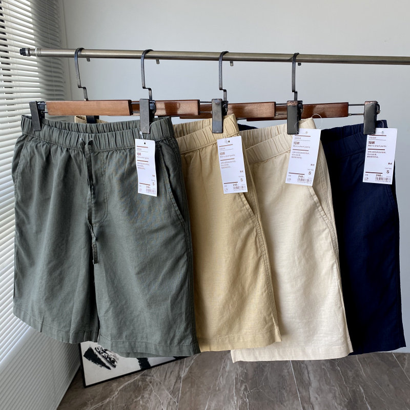 出口单!100亚麻!夏季新品男士舒适透气运动休闲纯色短裤五分裤