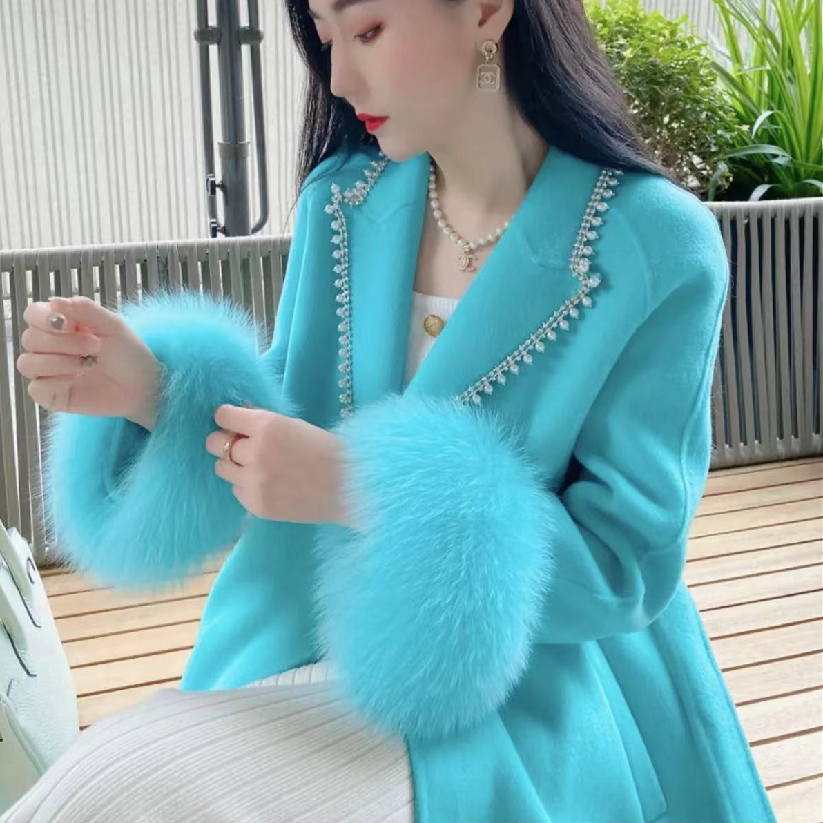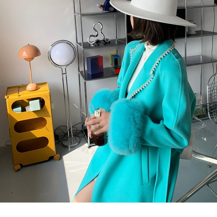 欧洲站2024冬季新款重工狐狸毛袖领口镶钻珍珠毛呢大衣女外套