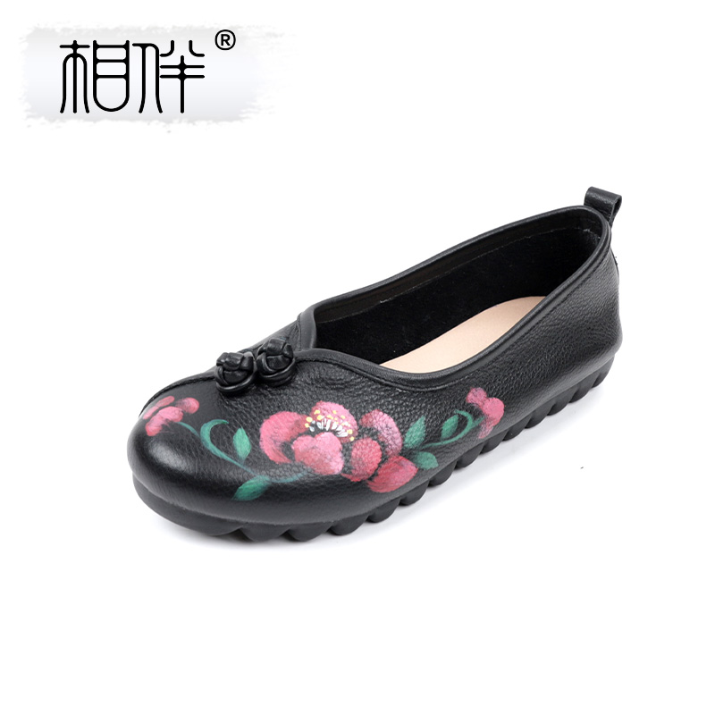 相伴真皮真皮浅口单鞋女2025秋季新款妈妈皮鞋手绘复古民族风女鞋