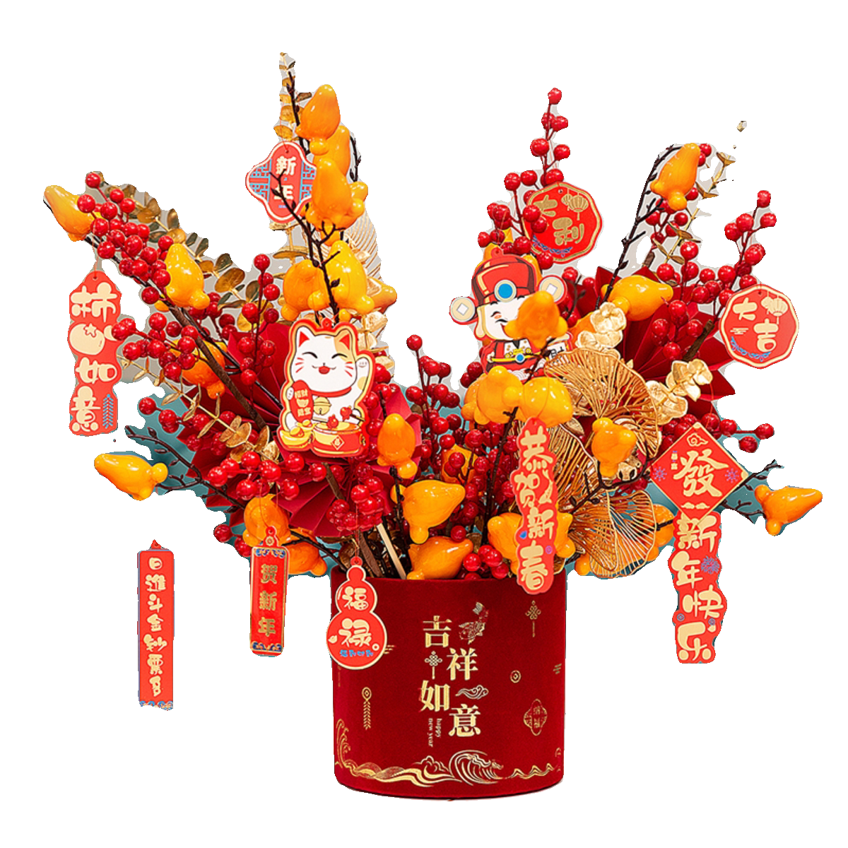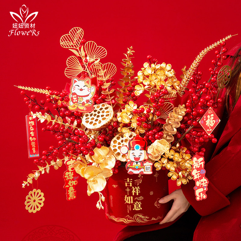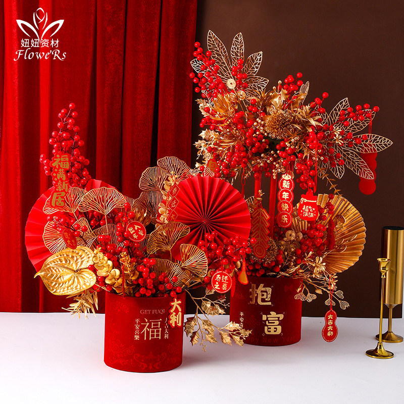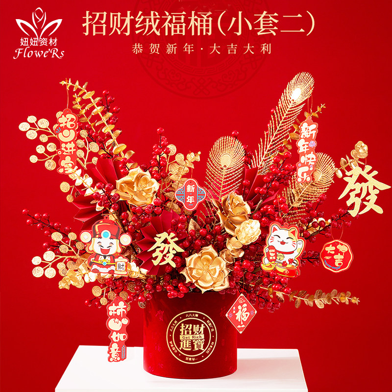 新年国潮绒福桶抱抱桶礼品盒红色金色干花插花花桶圆形年宵福字盒